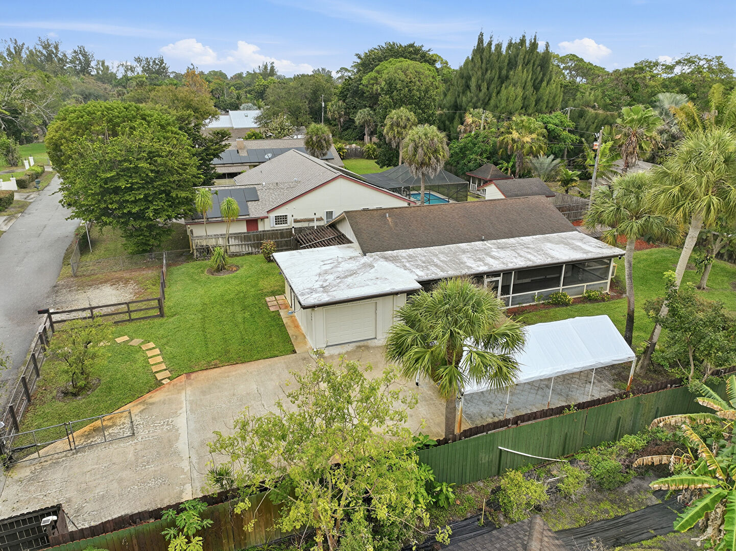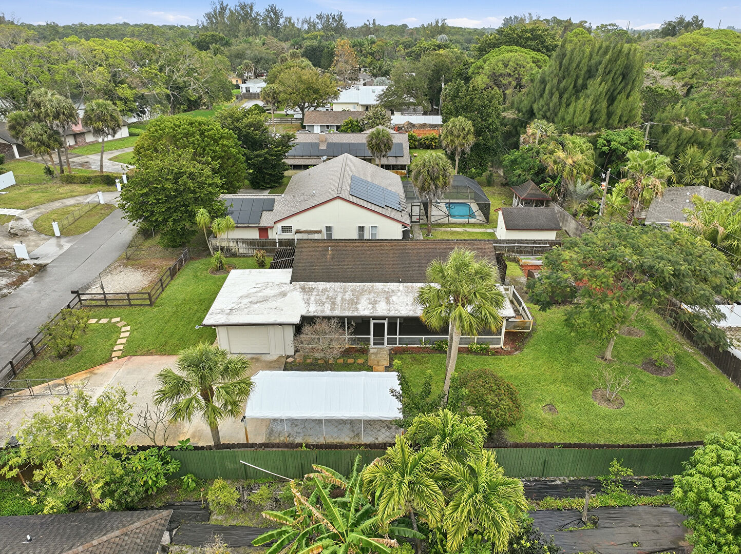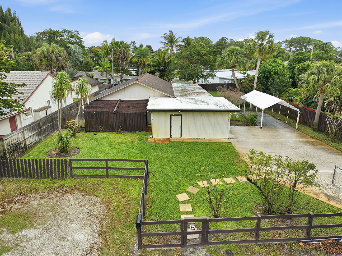 Detached Carport, Driveway, Fence, Lawn, Outdoor Structure, Patio, Pergola, Shed, Fence, Sunroom, Woods View