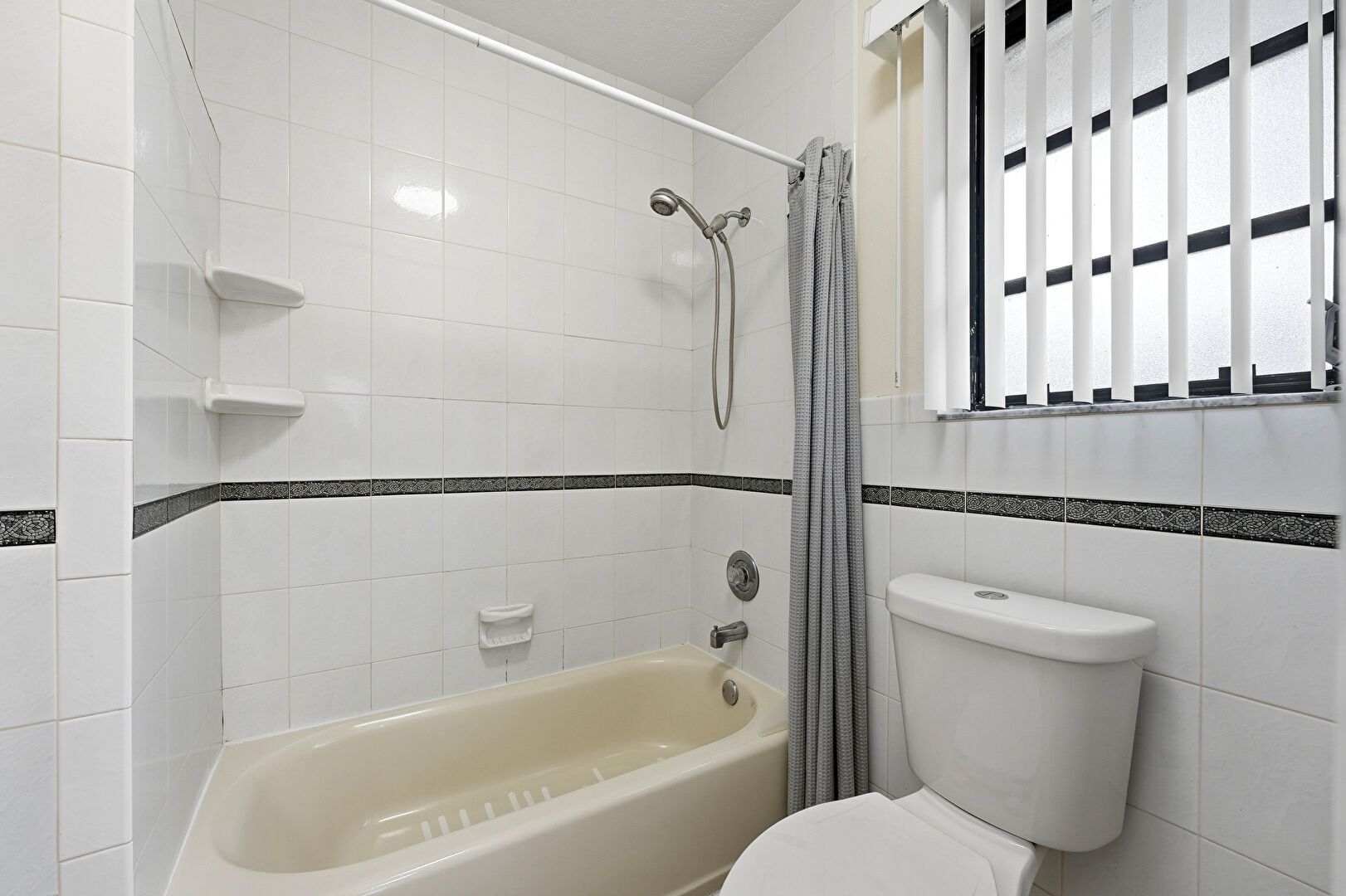 Baseboards Wall, Combined Bath Shower, Drywall, Full Bathroom, Half Bathroom, Natural Light, Tile Floor, Tile Wall, Vanity, Vent, Natural Light, Textured Ceiling