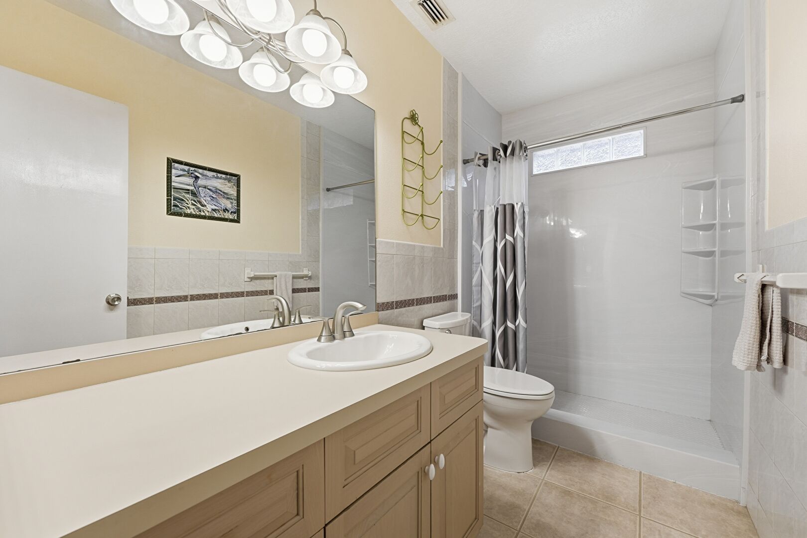 Drywall, Full Bathroom, Half Bathroom, Natural Light, Notable Chandelier, Textured Wall, Tile Floor, Tile Wall, Vanity, Vent, Wainscot Wall, Full Bathroom, Recessed Lighting, Vanity