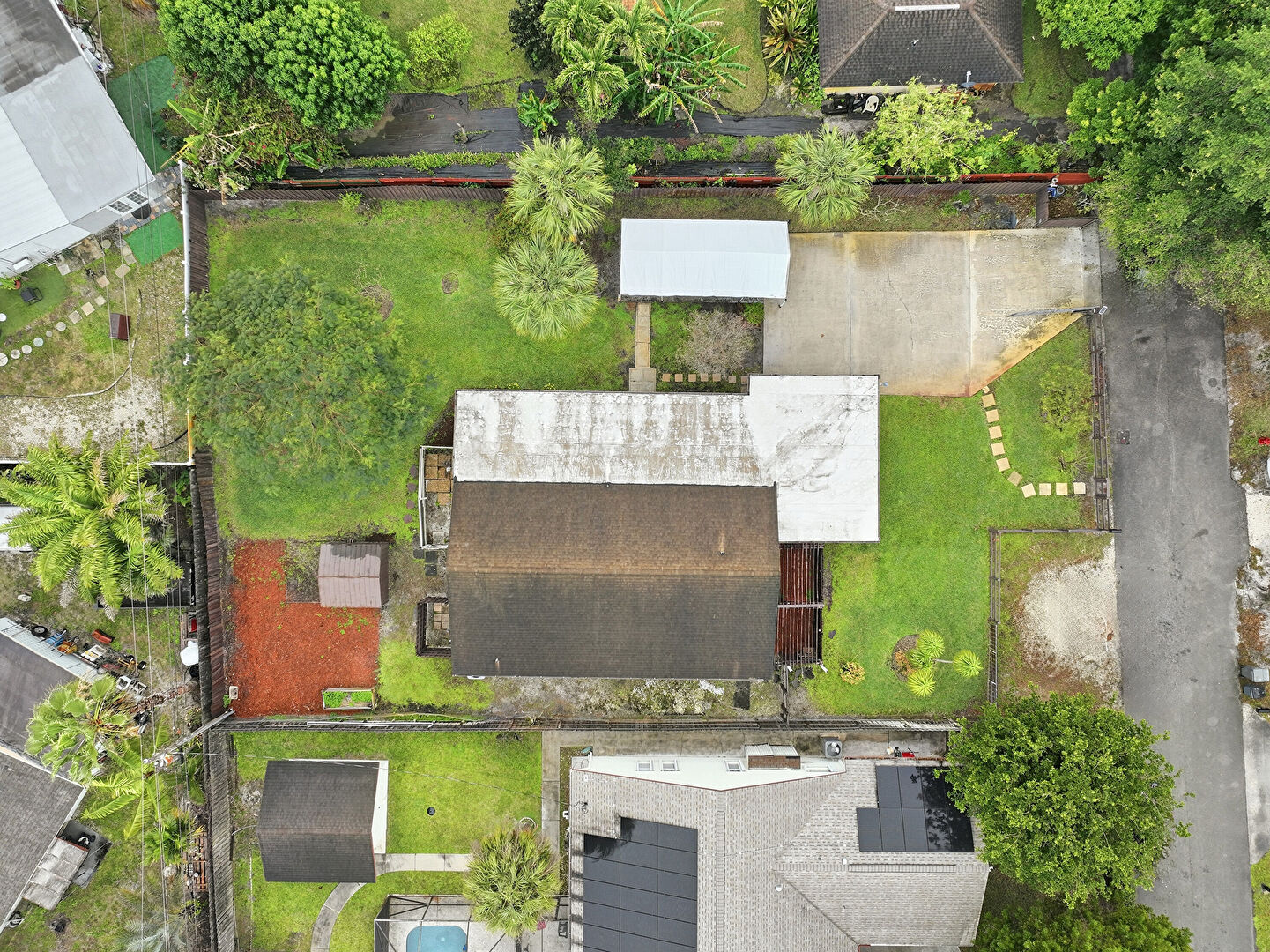 Carport, Detached Carport, Downspout, Driveway, Fence, Garage, Gutters, Lawn, Parking Pad, Sunroom, Vertical Siding, Lawn, Outdoor Structure, Sunroom, Vertical Siding