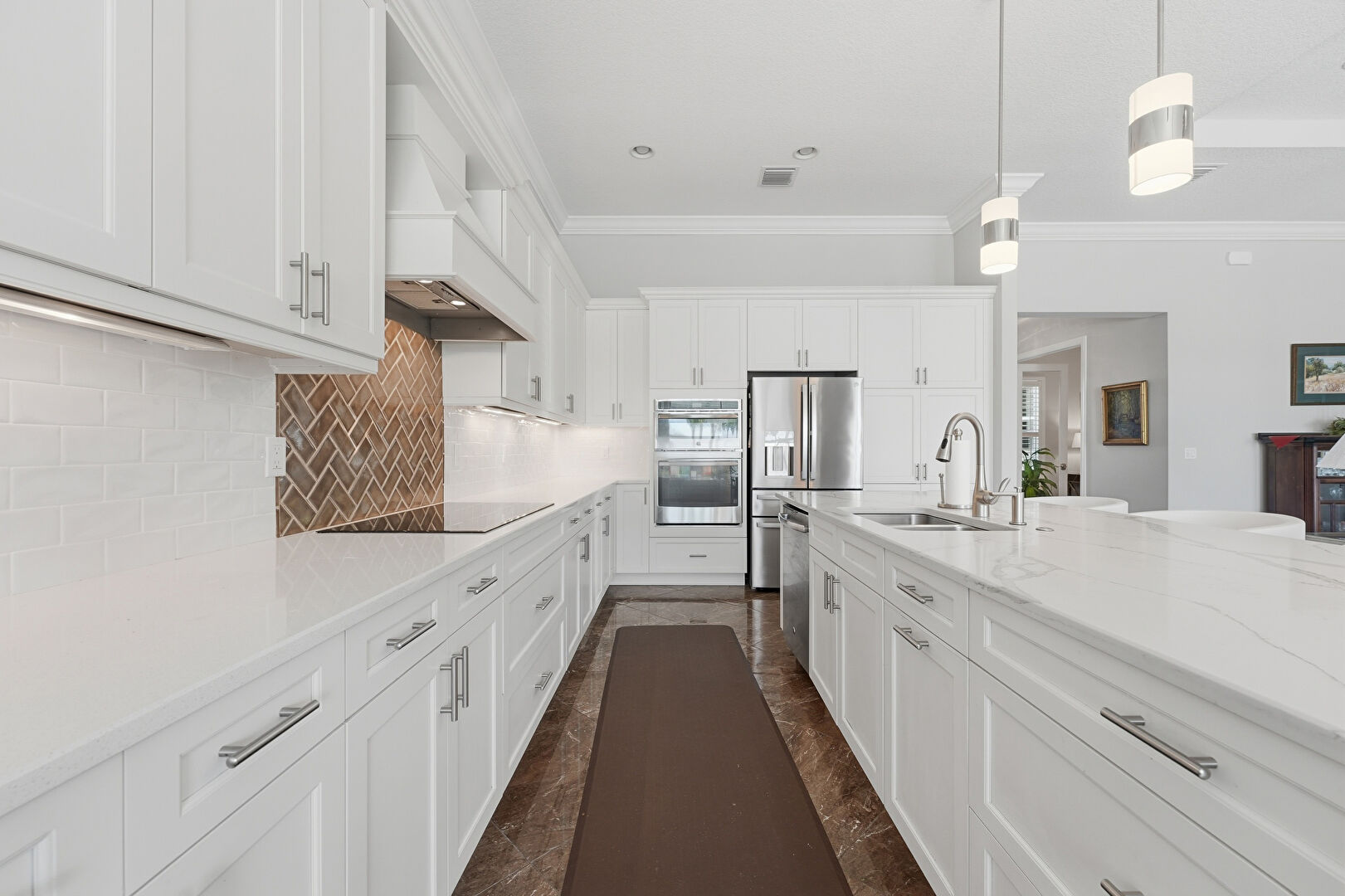 Baseboards Wall, Crown Molding, Crown Molding Cabinets, Double Oven, Drywall, Kitchen Bar, Kitchen Island, L Shaped Kitchen, Natural Light, Pendant Lighting, Recessed Lighting, Shaker Cabinets, Stone Countertops, Vent, Marble Finish Floor, Pendant Lighting