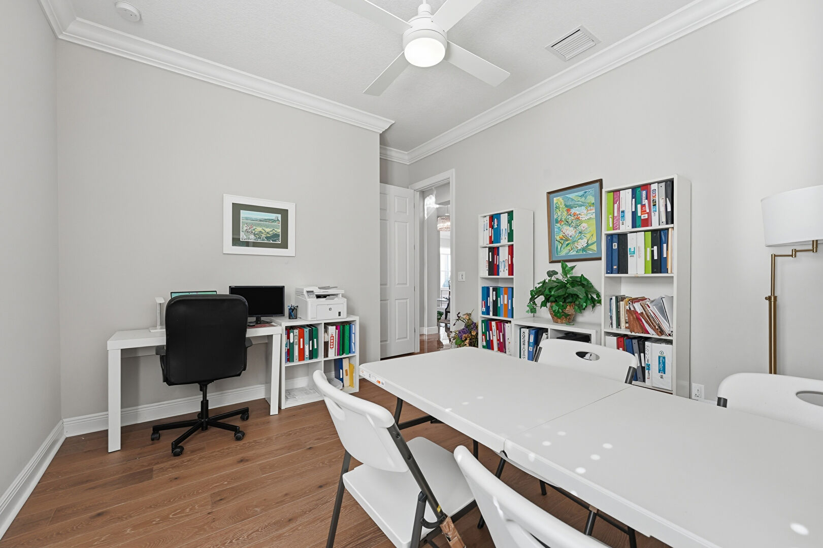 Baseboards Wall, Ceiling Fan, Closet, Crown Molding, Drywall, Natural Light, Office Area, Smoke Carbon Monoxide Detector, Tray Ceiling, Vent, Wood Finish Floor, Baseboards Wall, Ceiling Fan, Drywall, Natural Light, Office Area