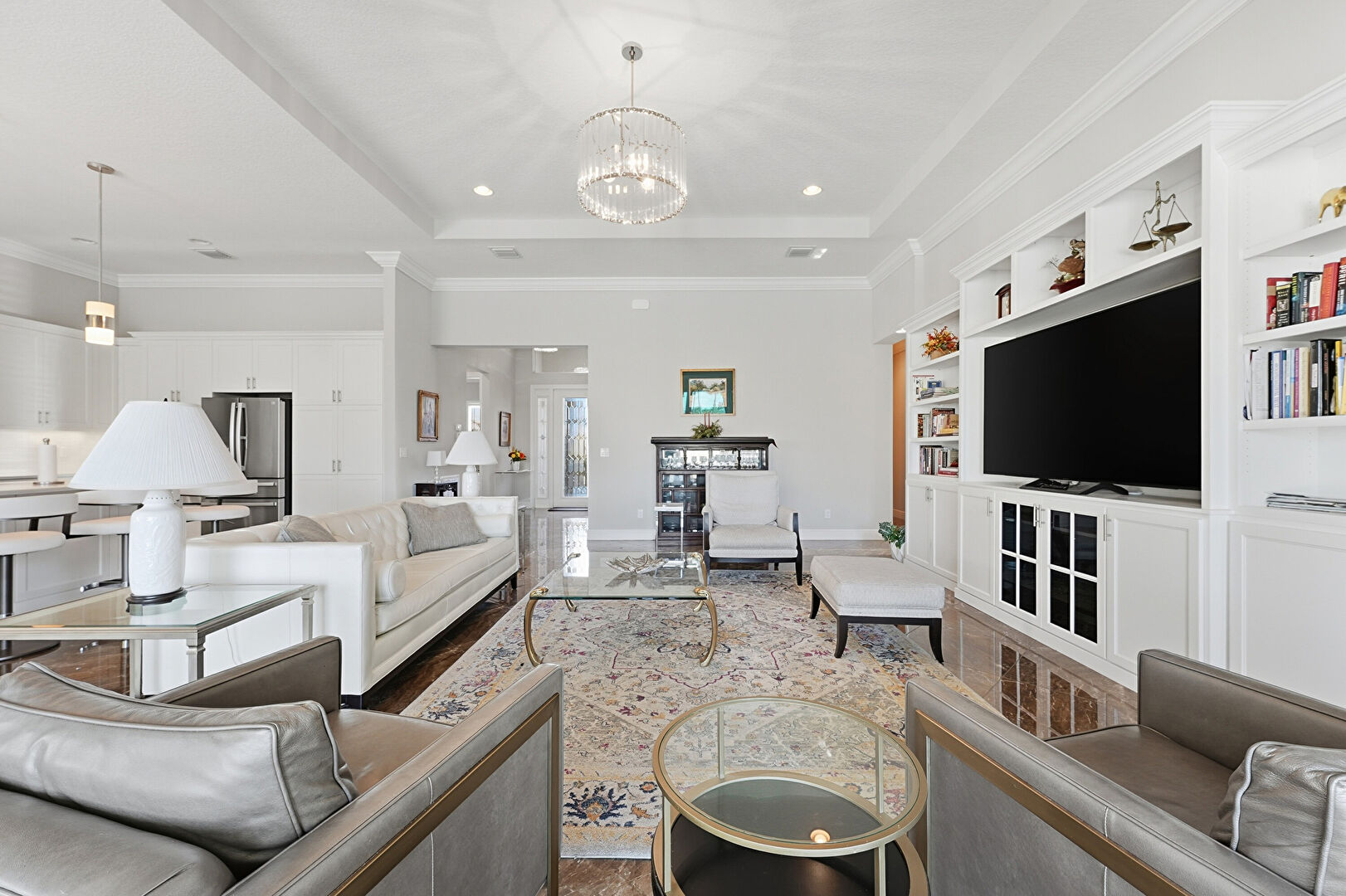 Baseboards Wall, Built In Shelves, Crown Molding, Drywall, Fireplace, L Shaped Kitchen, Marble Finish Floor, Natural Light, Notable Chandelier, Recessed Lighting, Tray Ceiling, Vent, Wood Finish Floor, Drywall, Marble Finish Floor, Notable Chandelier, Tray Ceiling