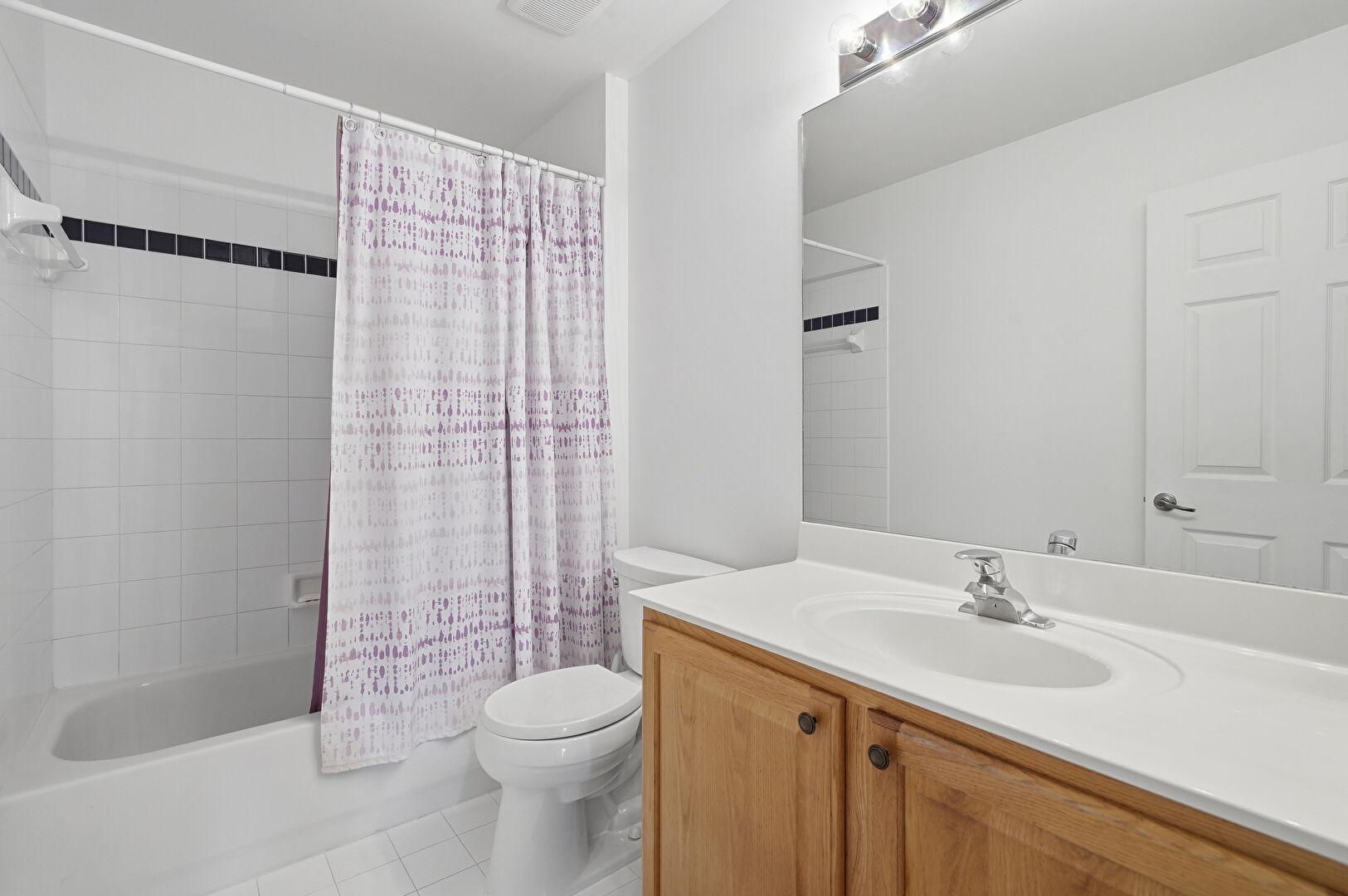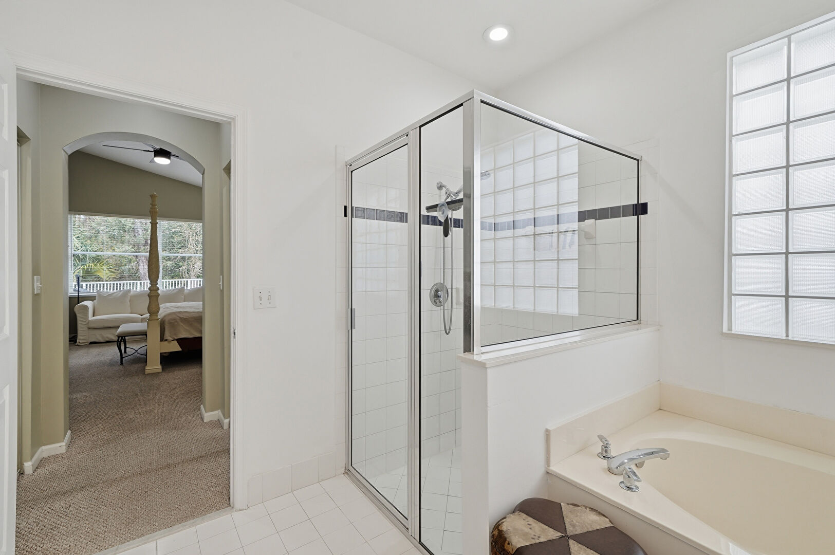 Baseboards Wall, Carpet, Double Vanity, Drywall, Ensuite Bathroom, Full Bathroom, Natural Light, Recessed Lighting, Tile Floor, Vanity, Vaulted Ceiling, Vent, Full Bathroom, Natural Light, Tile Floor