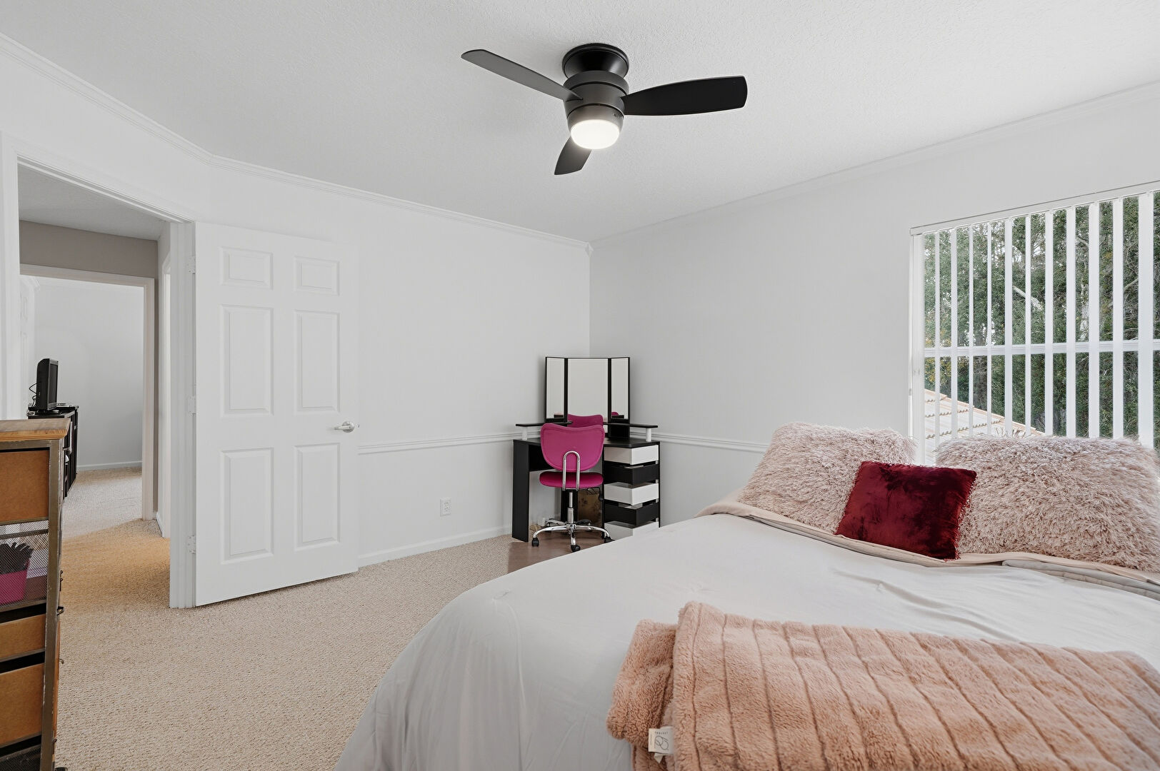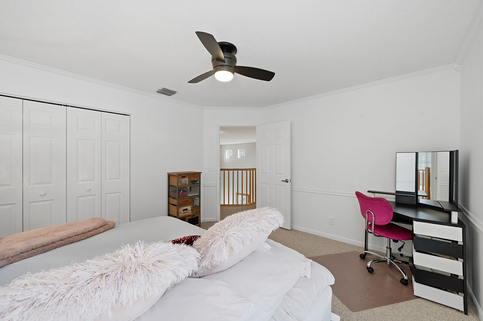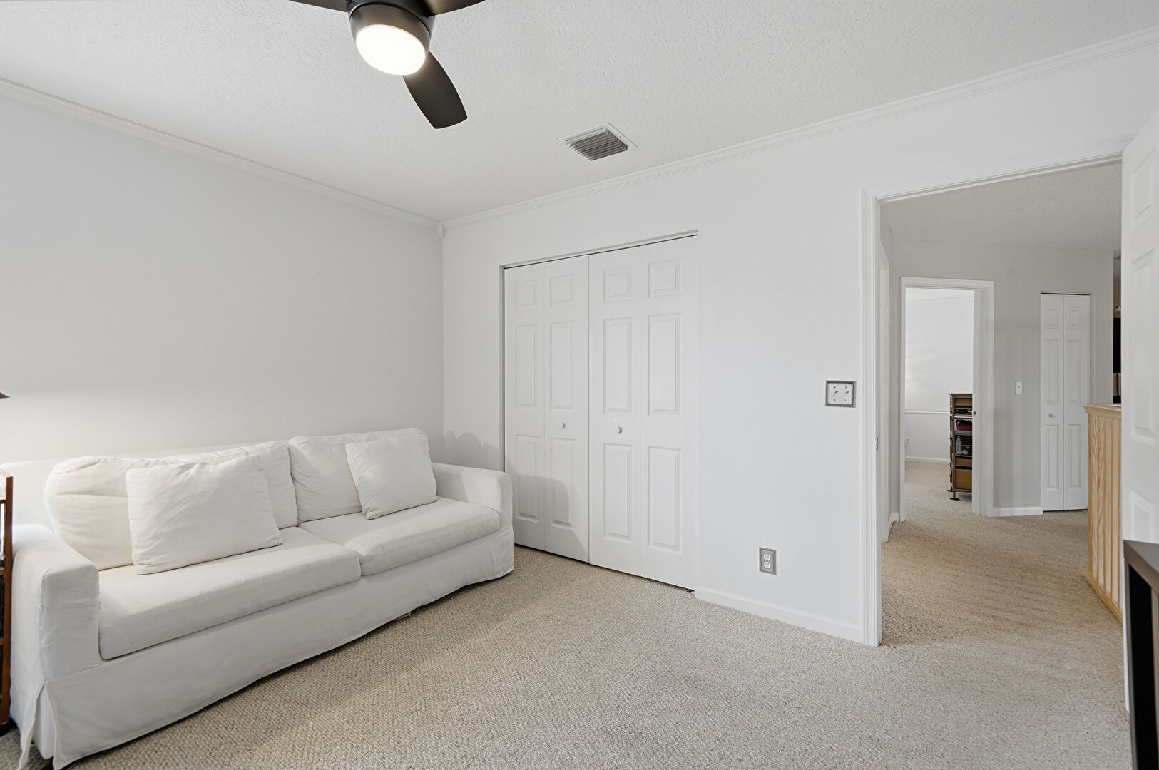 Baseboards Wall, Carpet, Ceiling Fan, Closet, Crown Molding, Drywall, Natural Light, Office Area, Vent, Carpet, Natural Light