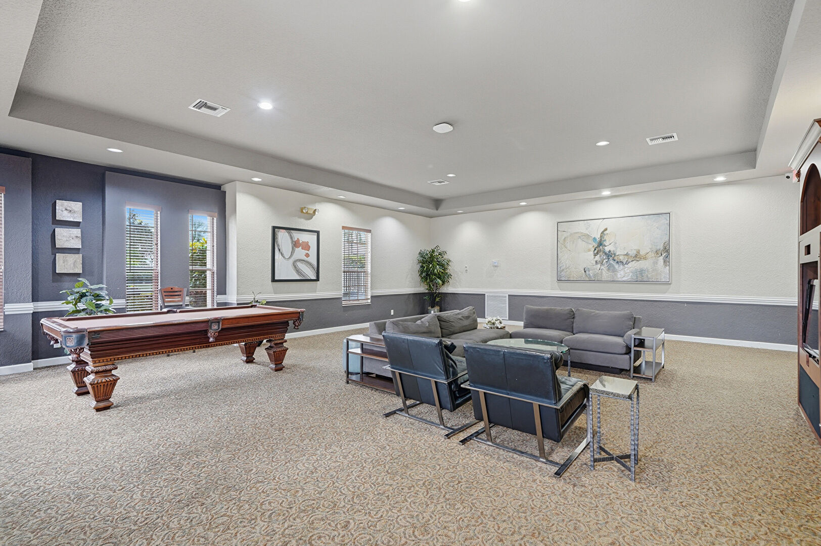 Baseboards Wall, Beamed Ceiling, Billiards, Carpet, Coffered Ceiling, Crown Molding, Drywall, High Ceiling, Natural Light, Recessed Lighting, Tray Ceiling, Vent, Baseboards Wall, Recessed Lighting