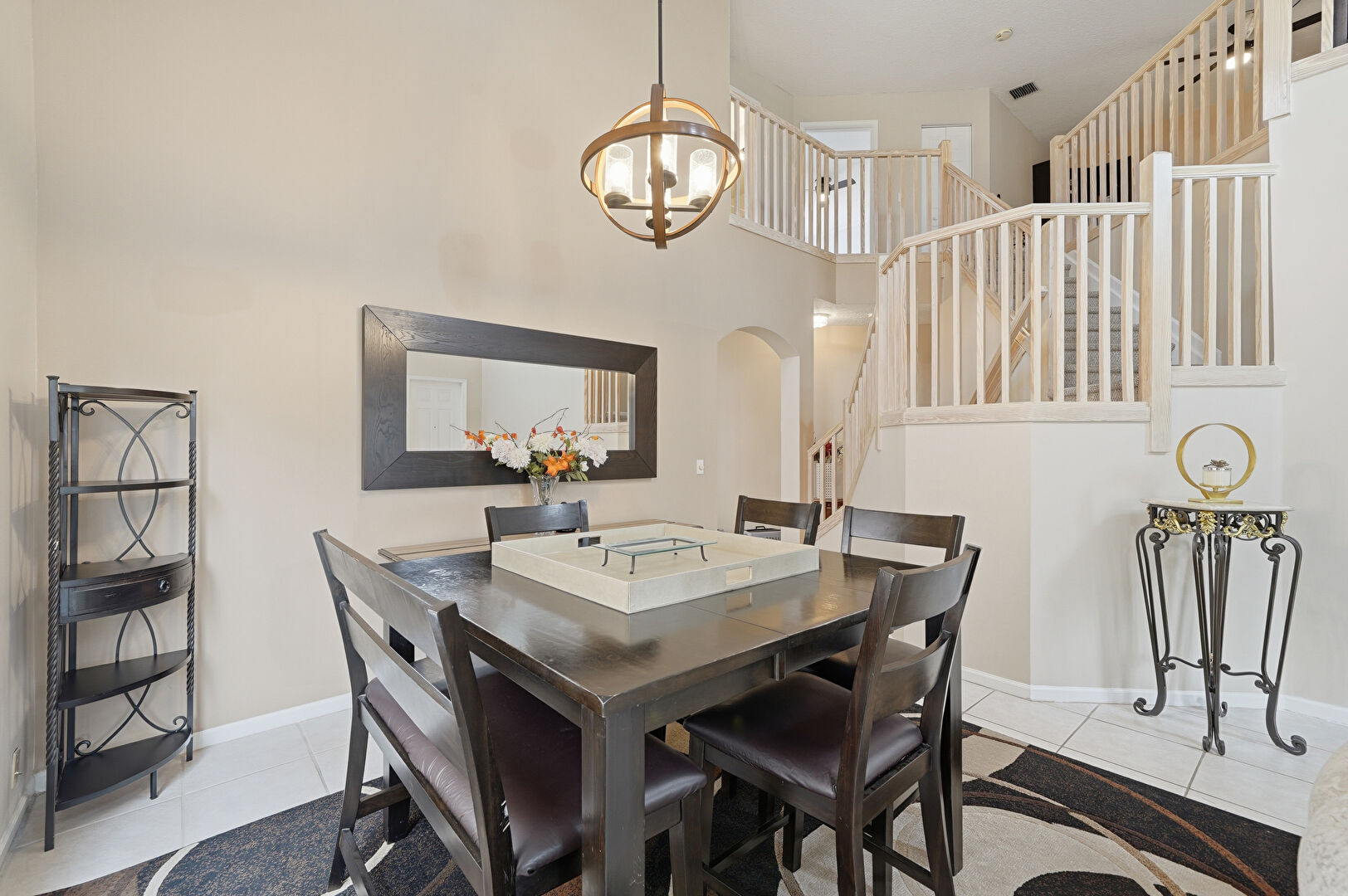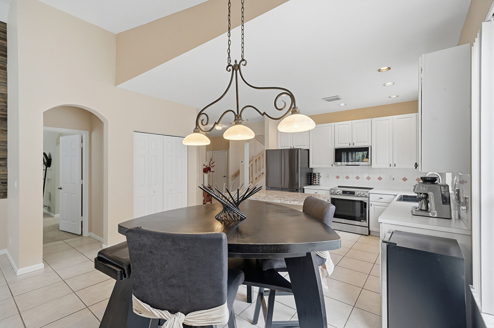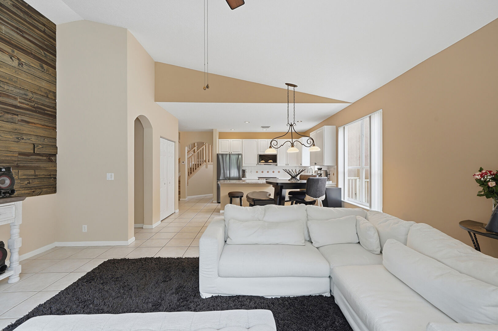 Accent Wall, Arched Walkways, Baseboards Wall, Ceiling Fan, Drywall, High Ceiling, L Shaped Kitchen, Natural Light, Notable Chandelier, Recessed Lighting, Stairs, Tile Floor, Vaulted Ceiling, Vent, Ceiling Fan, Tile Floor, Vaulted Ceiling, Wood Wall