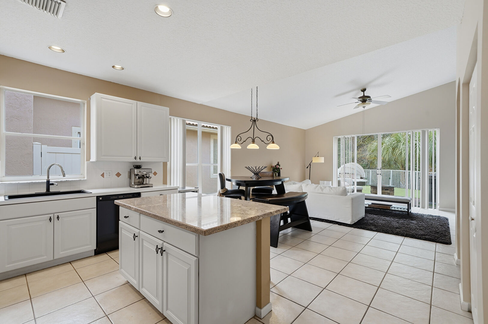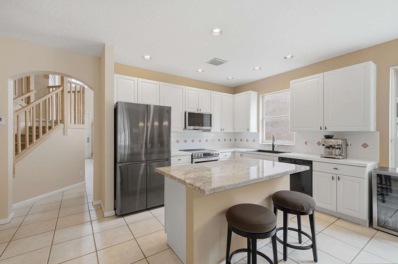 Arched Walkways, Baseboards Wall, Ceiling Fan, Drywall, Kitchen Bar, Kitchen Island, Natural Light, Opens To Living Area, Pendant Lighting, Raised Cabinets, Recessed Lighting, Stone Countertops, Tile Floor, Vaulted Ceiling, Vent, Wine Cooler, Ceiling Fan, Drywall, Kitchen Island, L Shaped Kitchen, Raised Cabinets, Stone Countertops