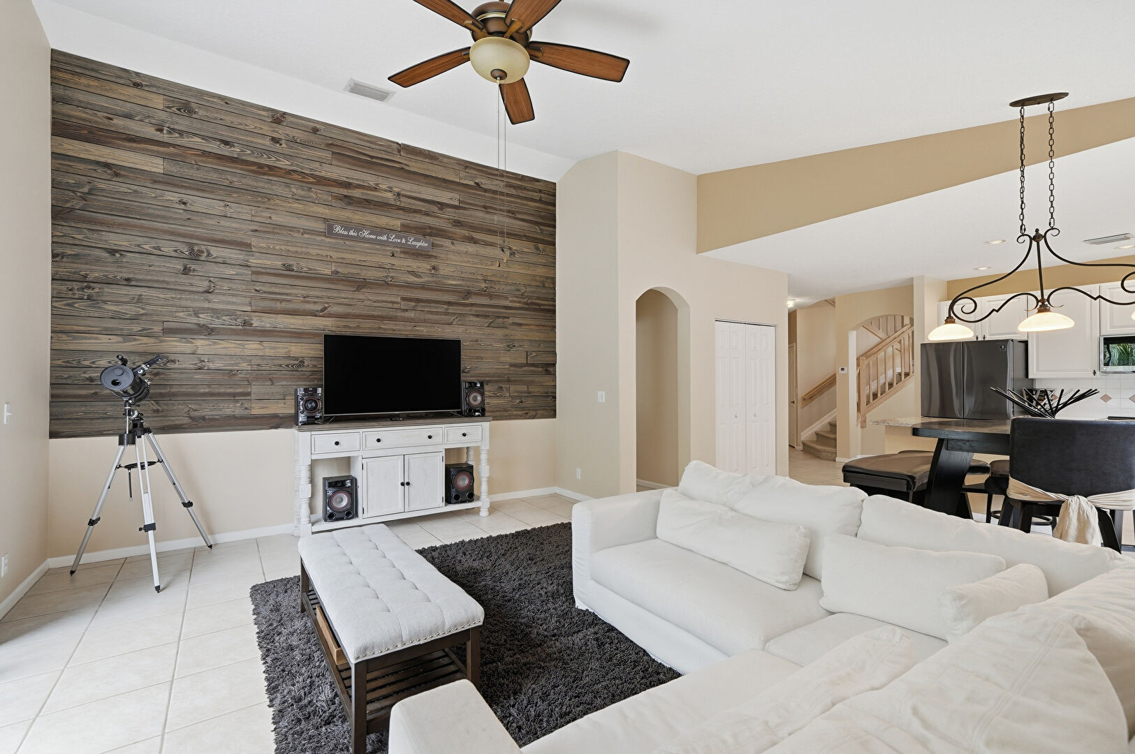 Accent Wall, Arched Walkways, Baseboards Wall, Ceiling Fan, Drywall, Fireplace, High Ceiling, L Shaped Kitchen, Natural Light, Notable Chandelier, Stairs, Tile Floor, Vaulted Ceiling, Vent, Wood Wall, Accent Wall, Drywall, High Ceiling, Stairs, Tile Floor