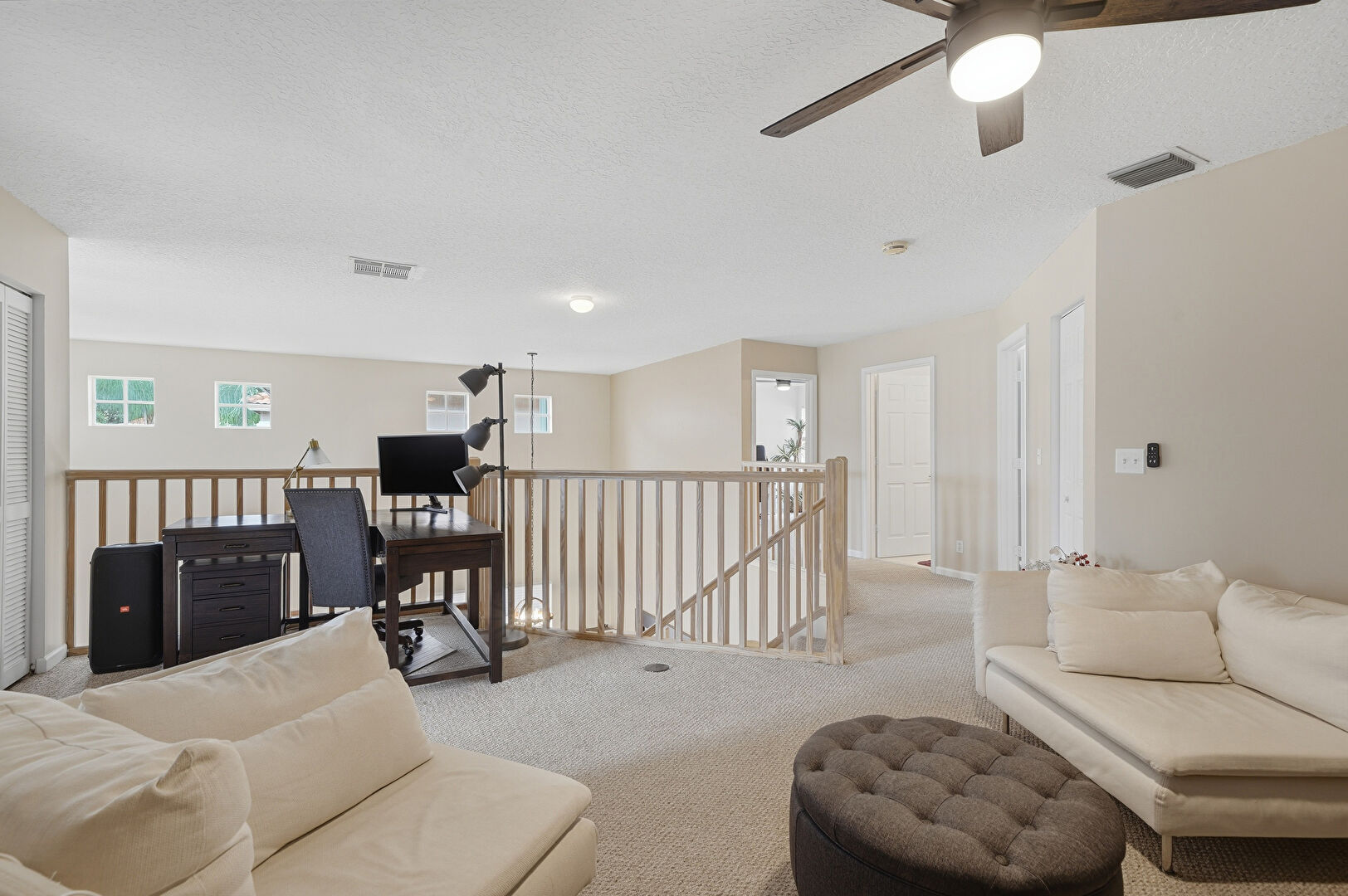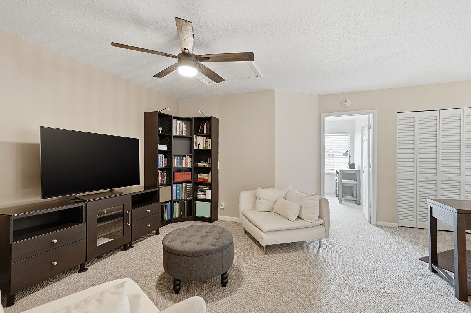 Baseboards Wall, Carpet, Ceiling Fan, Drywall, Natural Light, Office Area, Scuttle, Textured Ceiling, Vent, Baseboards Wall, Ceiling Fan, Natural Light, Textured Ceiling