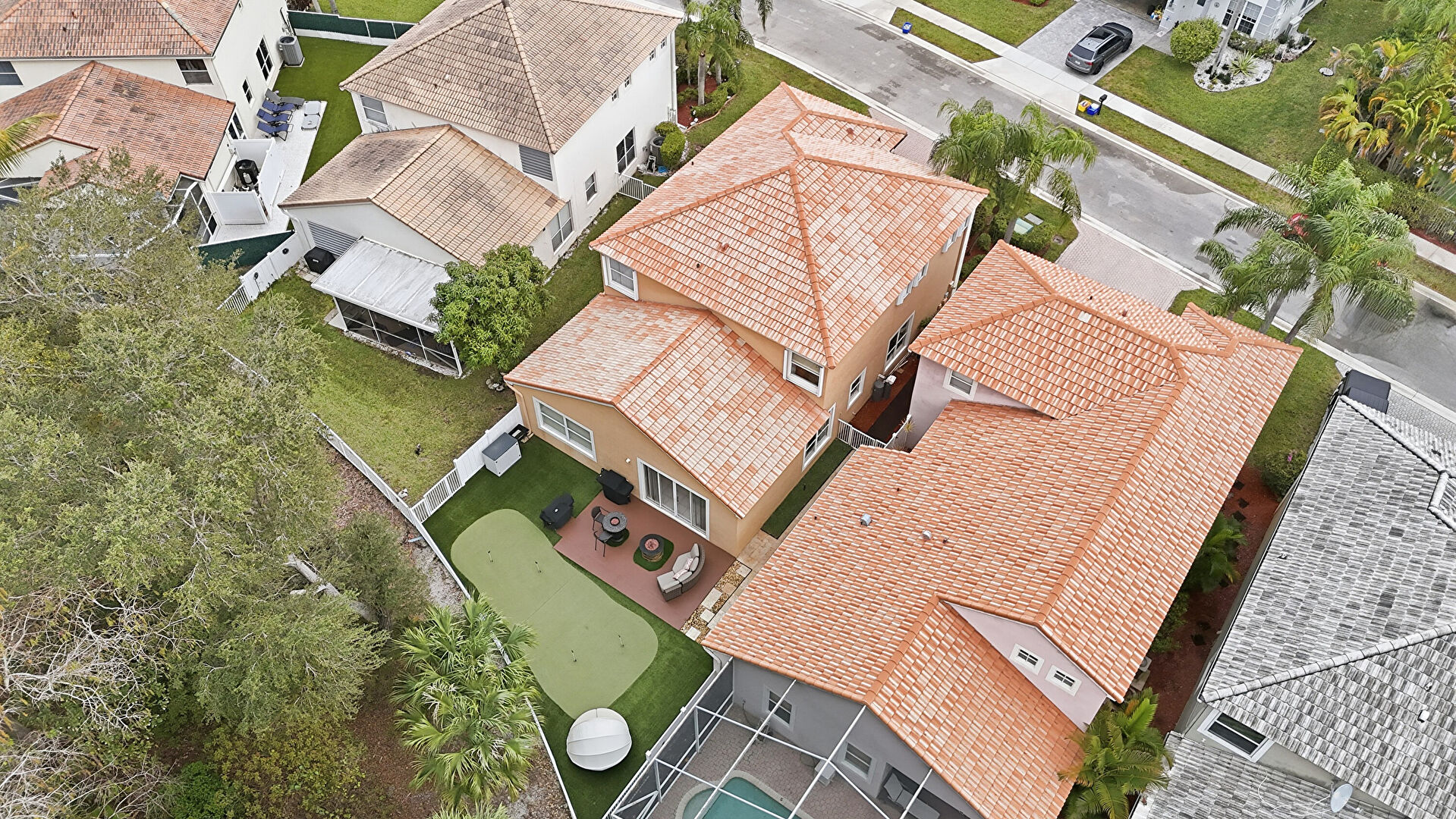 Downspout, Fence, Gate, Grill, Gutters, Lawn, Outdoor Living Space, Patio, Putting Green, Stucco Siding, Tile Roof, Fence, Outdoor Living Space