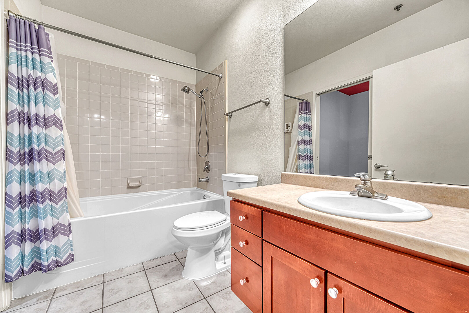 Baseboards Wall, Combined Bath Shower, Full Bathroom, Textured Wall, Tile Floor, Vanity, Full Bathroom, Tile Floor