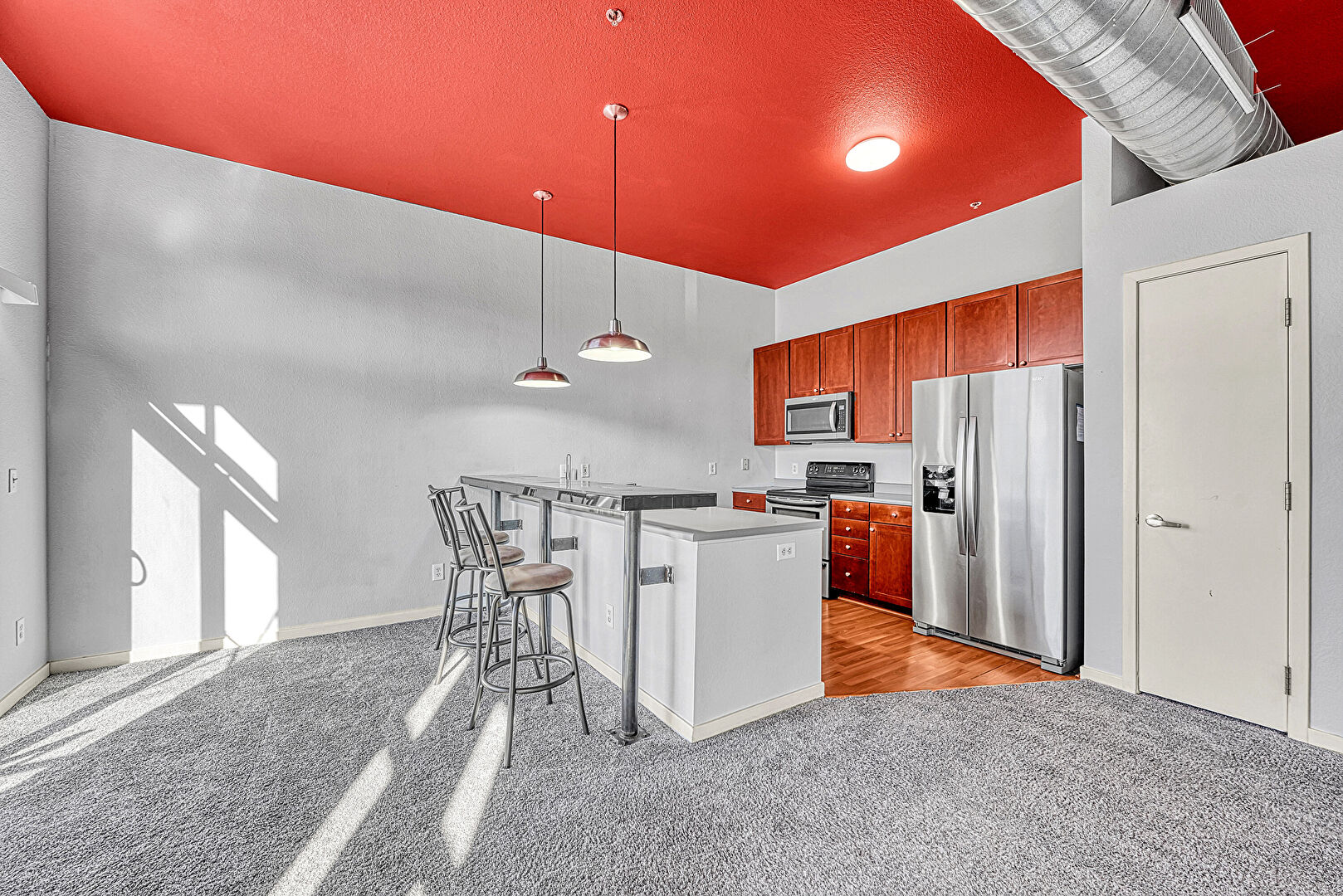 Baseboards Wall, Carpet, Drywall, Galley Kitchen, High Ceiling, Kitchen Bar, Kitchen Peninsula, Medium Brown Cabinets, Natural Light, Opens To Living Area, Pendant Lighting, Reddish Brown Cabinets, Shaker Cabinets, Stainless Steel Countertops, Stone Countertops, Textured Wall, Vent, Wood Finish Floor, Carpet, Kitchen Bar, Pendant Lighting, Reddish Brown Cabinets