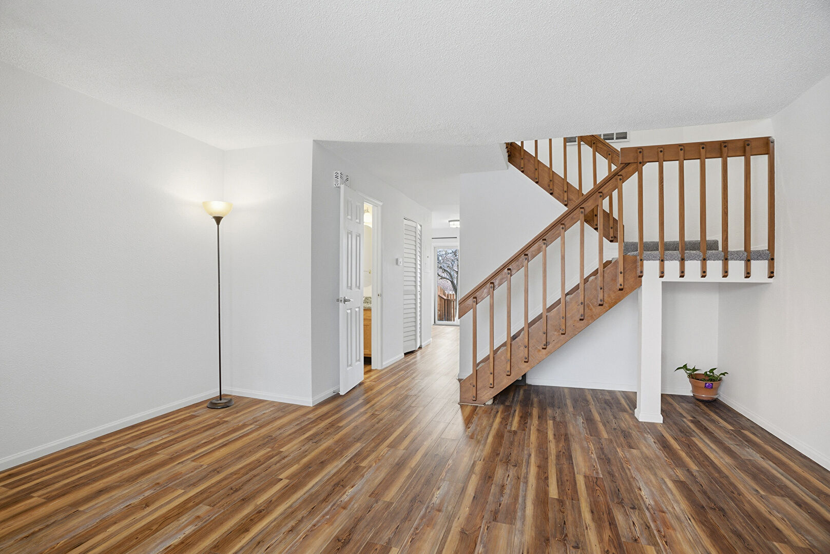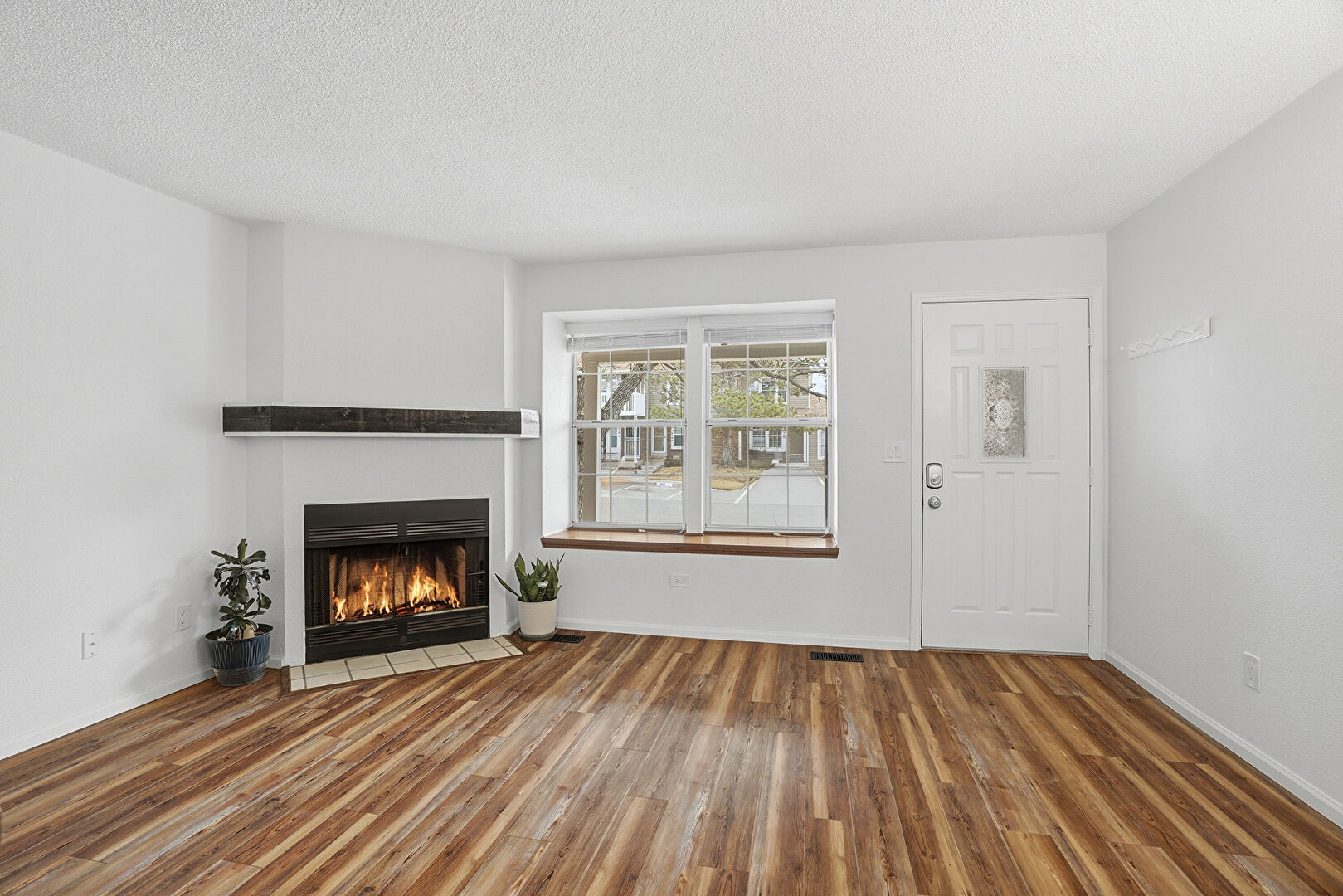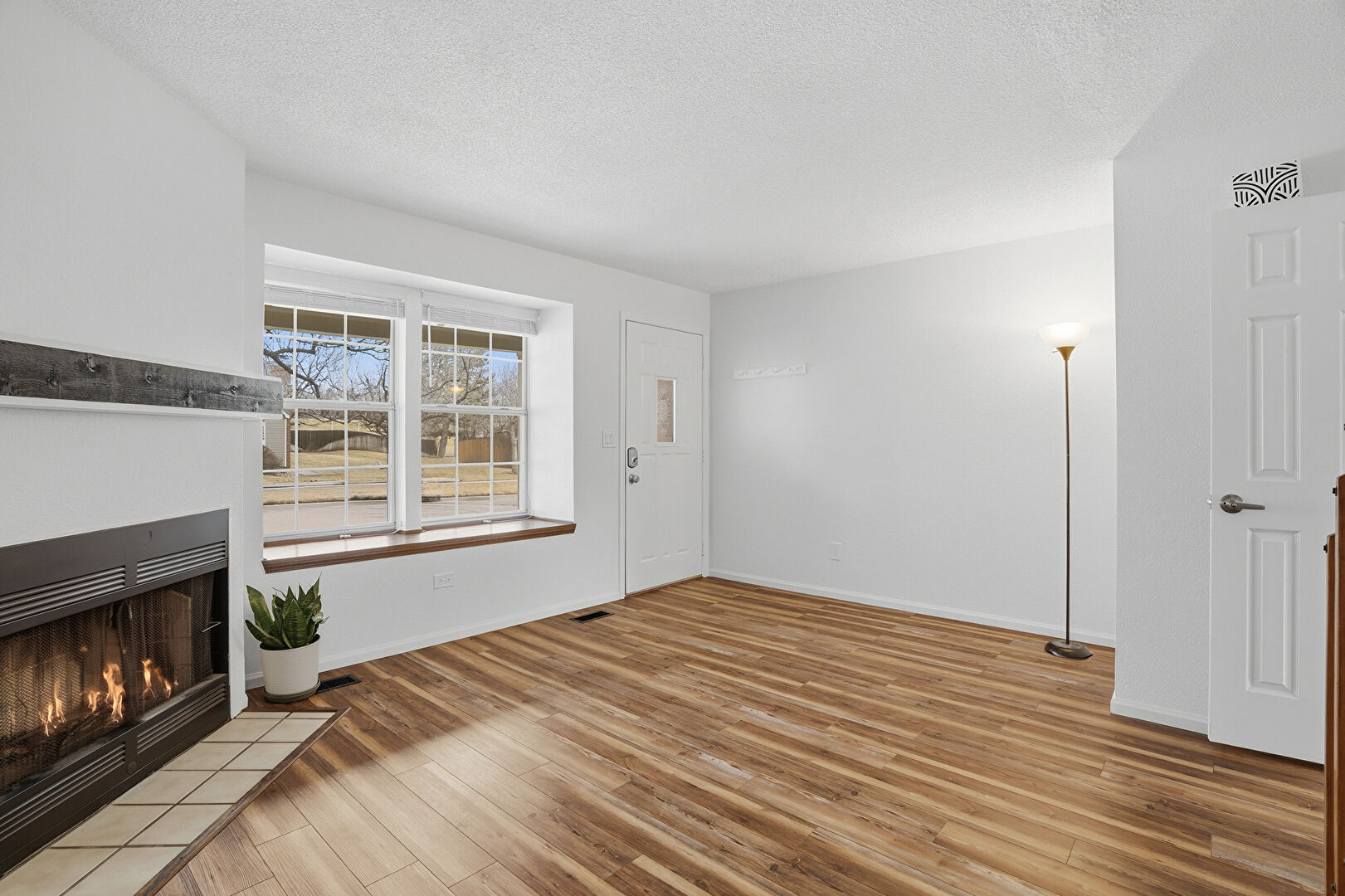 Baseboards Wall, Drywall, Fireplace, Natural Light, Stairs, Textured Ceiling, Vent, Wood Finish Floor, Drywall, Fireplace, Stairs, Wood Finish Floor