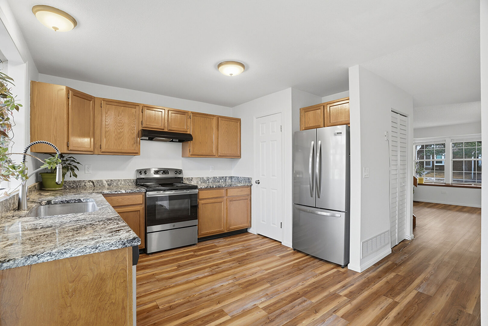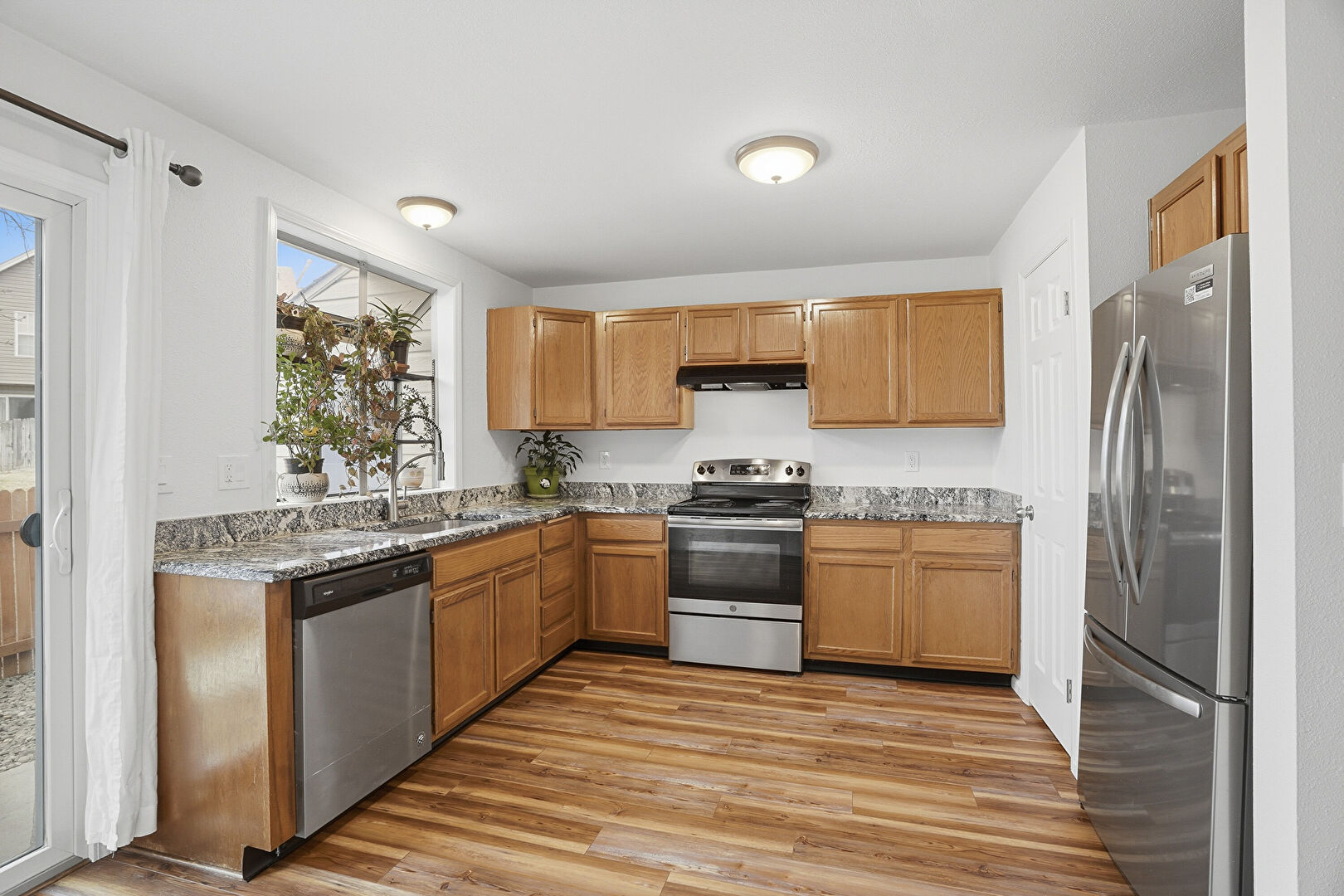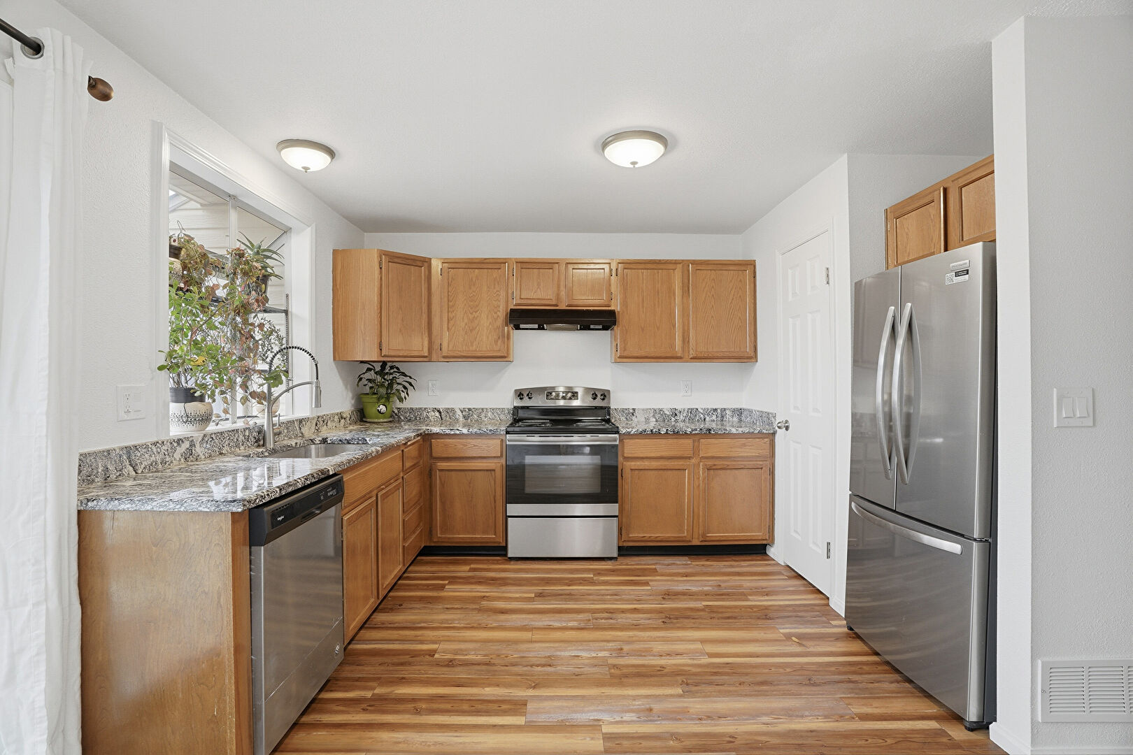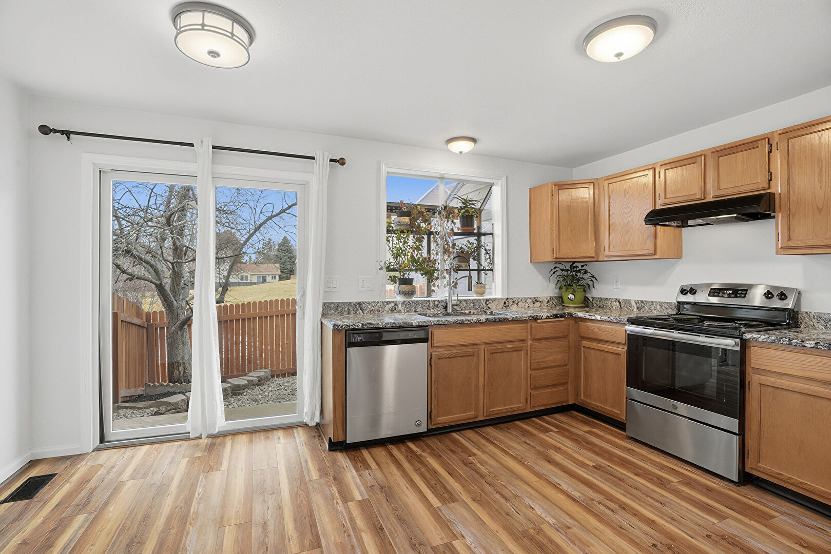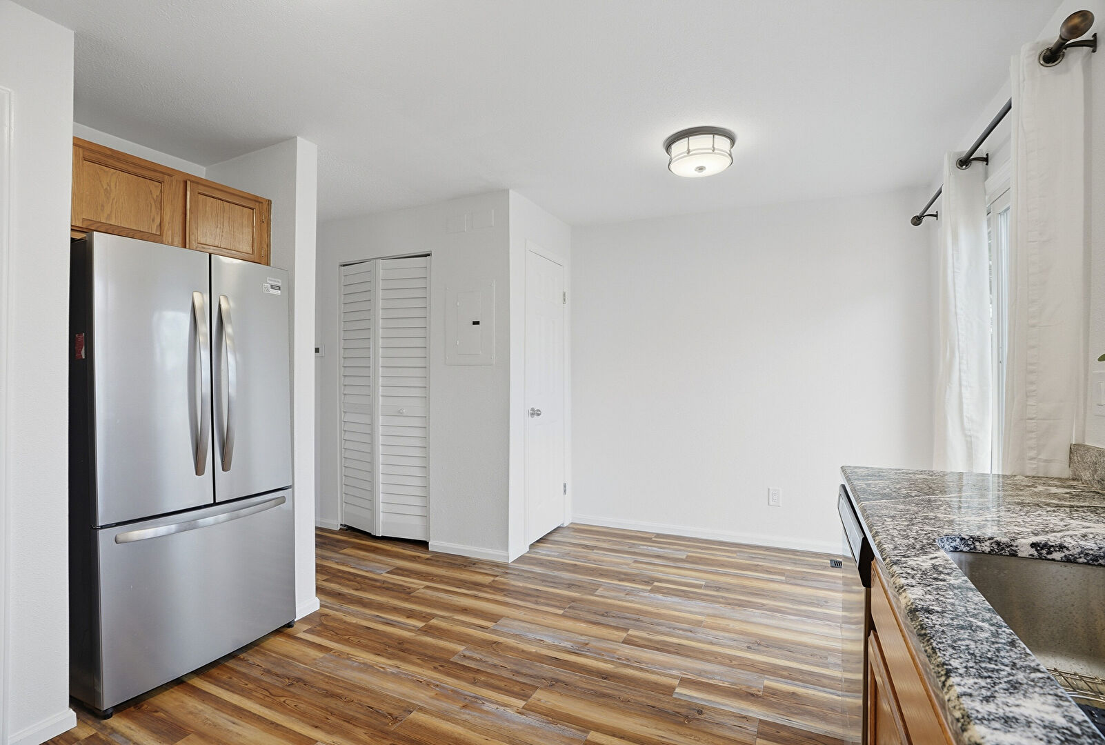 Baseboards Wall, Drywall, Electric Panel, Medium Brown Cabinets, Natural Light, Shaker Cabinets, Stone Countertops, U Shaped Kitchen, Vent, Visible Hinge Cabinets, Wood Finish Floor, Medium Brown Cabinets, Shaker Cabinets, Stone Countertops, Visible Hinge Cabinets