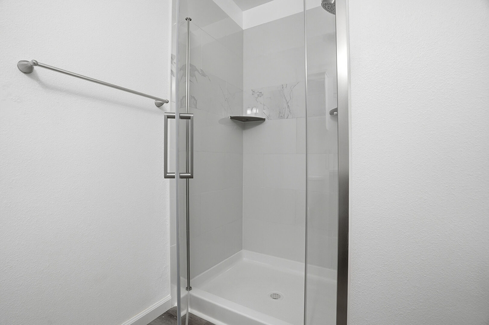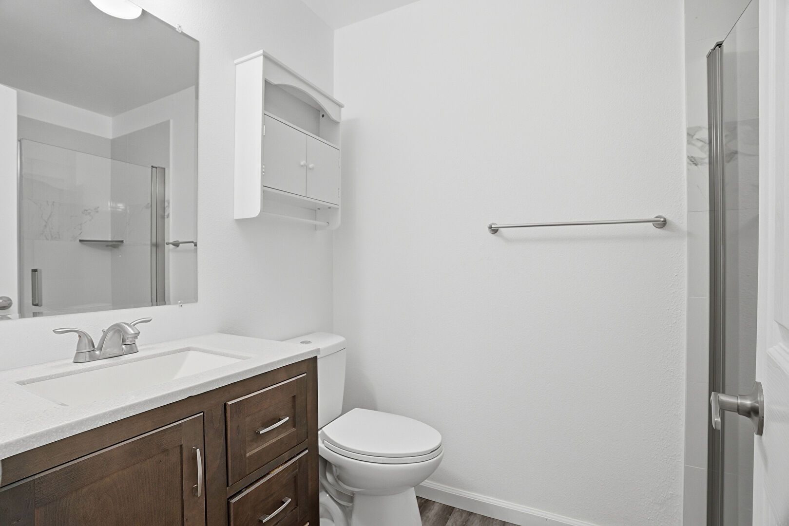 Baseboards Wall, Combined Bath Shower, Drywall, Full Bathroom, Wood Finish Floor, Combined Bath Shower, Vanity