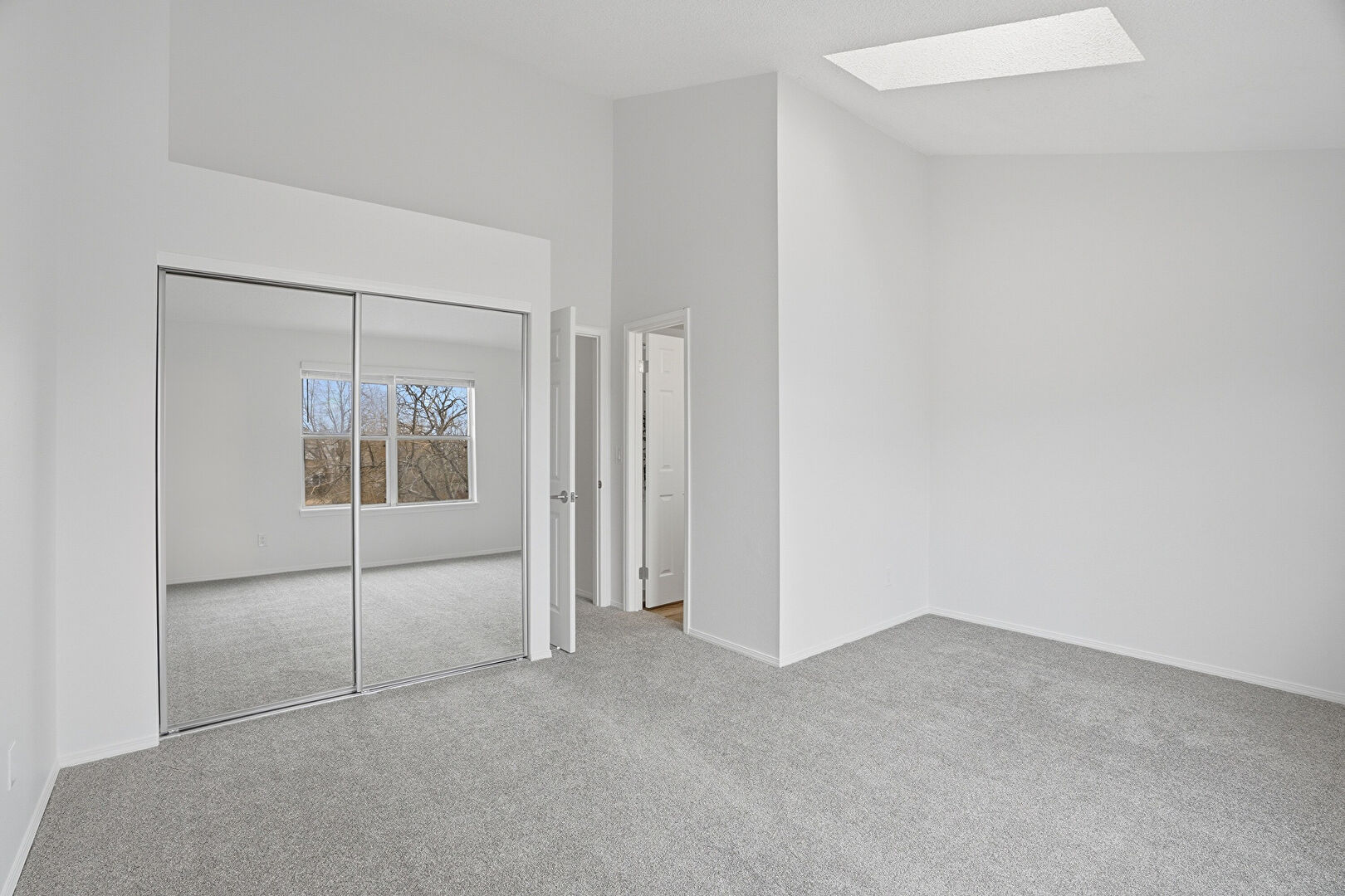 Baseboards Wall, Carpet, Closet, Drywall, High Ceiling, Natural Light, Skylight, Vaulted Ceiling, Baseboards Wall, Skylight