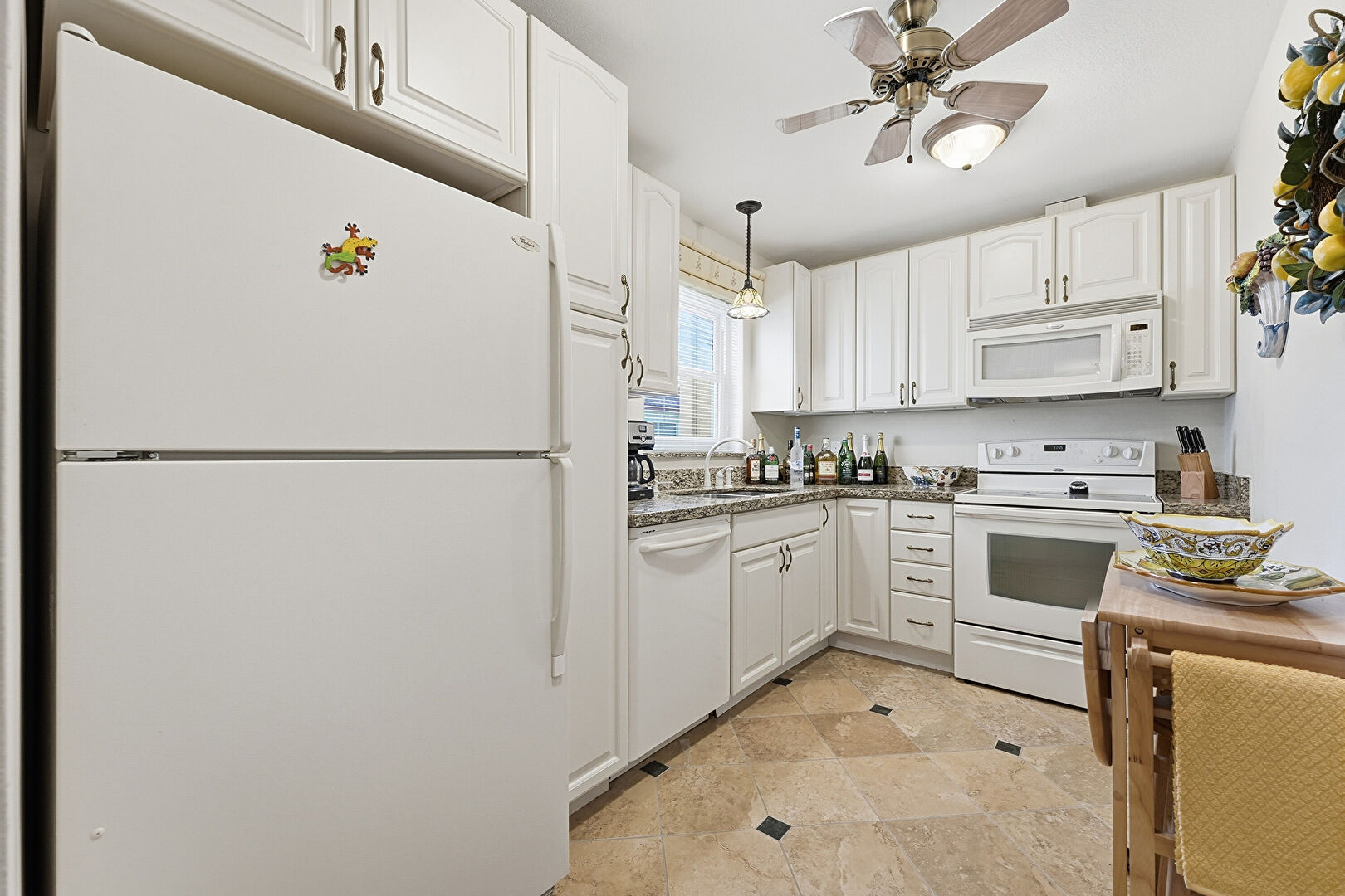Arched Cabinets, Ceiling Fan, Drywall, Natural Light, Pendant Lighting, Raised Cabinets, Stone Finish Floor, Stone Countertops