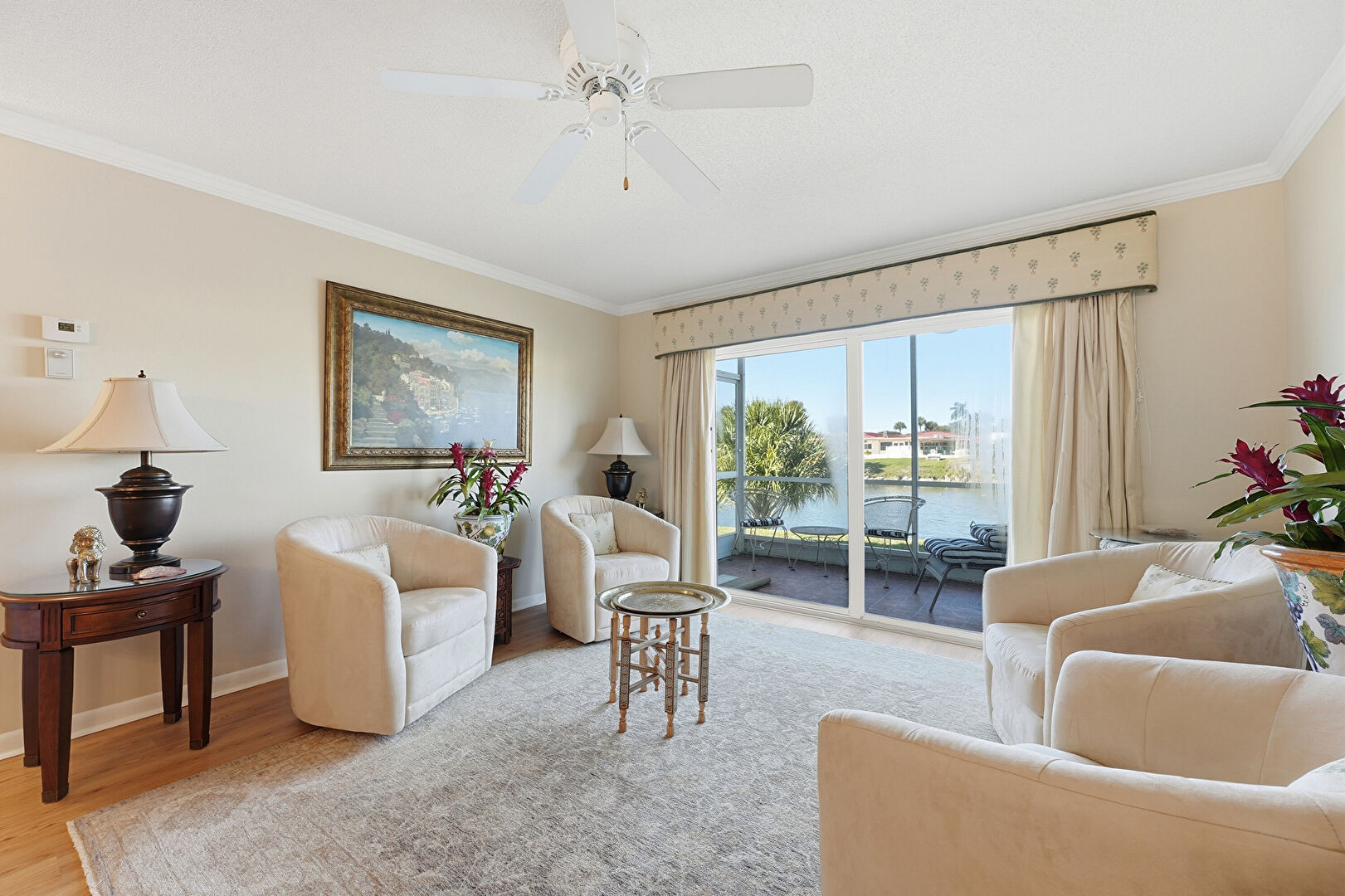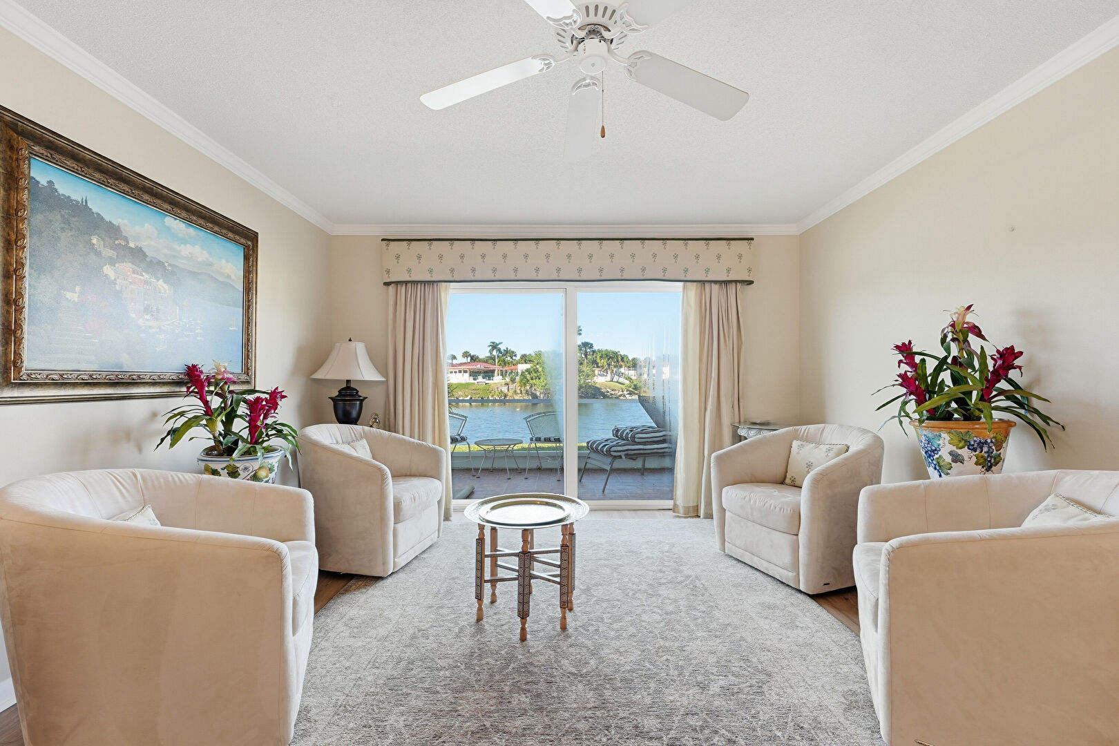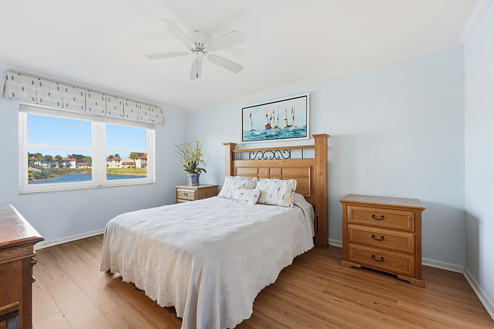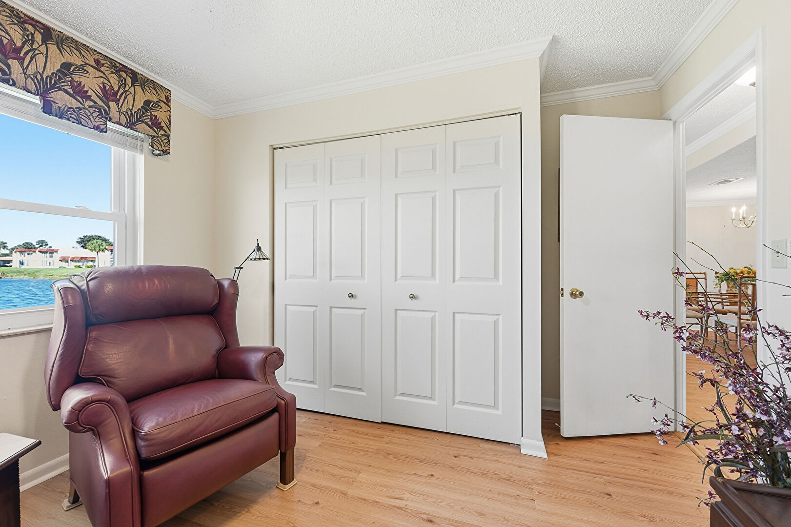 Baseboards Wall, Ceiling Fan, Crown Molding, Drywall, Natural Light, Notable Chandelier, Smoke Carbon Monoxide Detector, Water View, Waterfront, Wood Finish Floor, Drywall, Vent, Waterfront