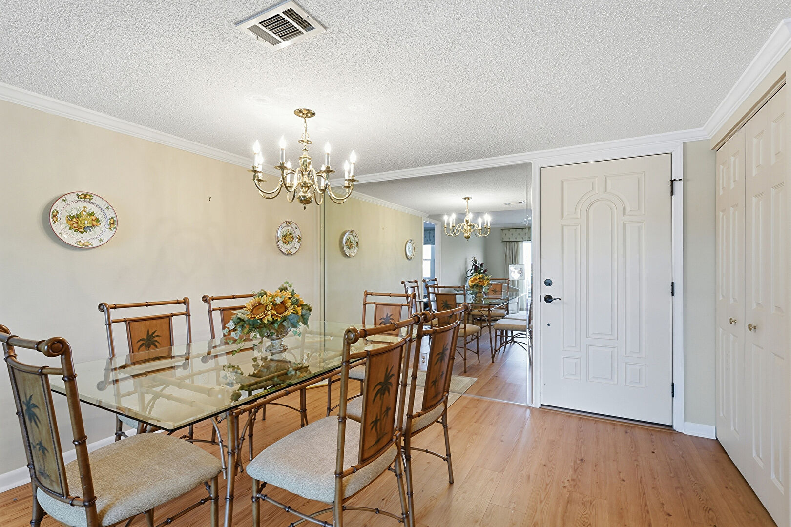 Baseboards Wall, Ceiling Fan, Crown Molding, Drywall, Natural Light, Notable Chandelier, Textured Ceiling, Vent, Wood Finish Floor, Notable Chandelier, Wood Finish Floor