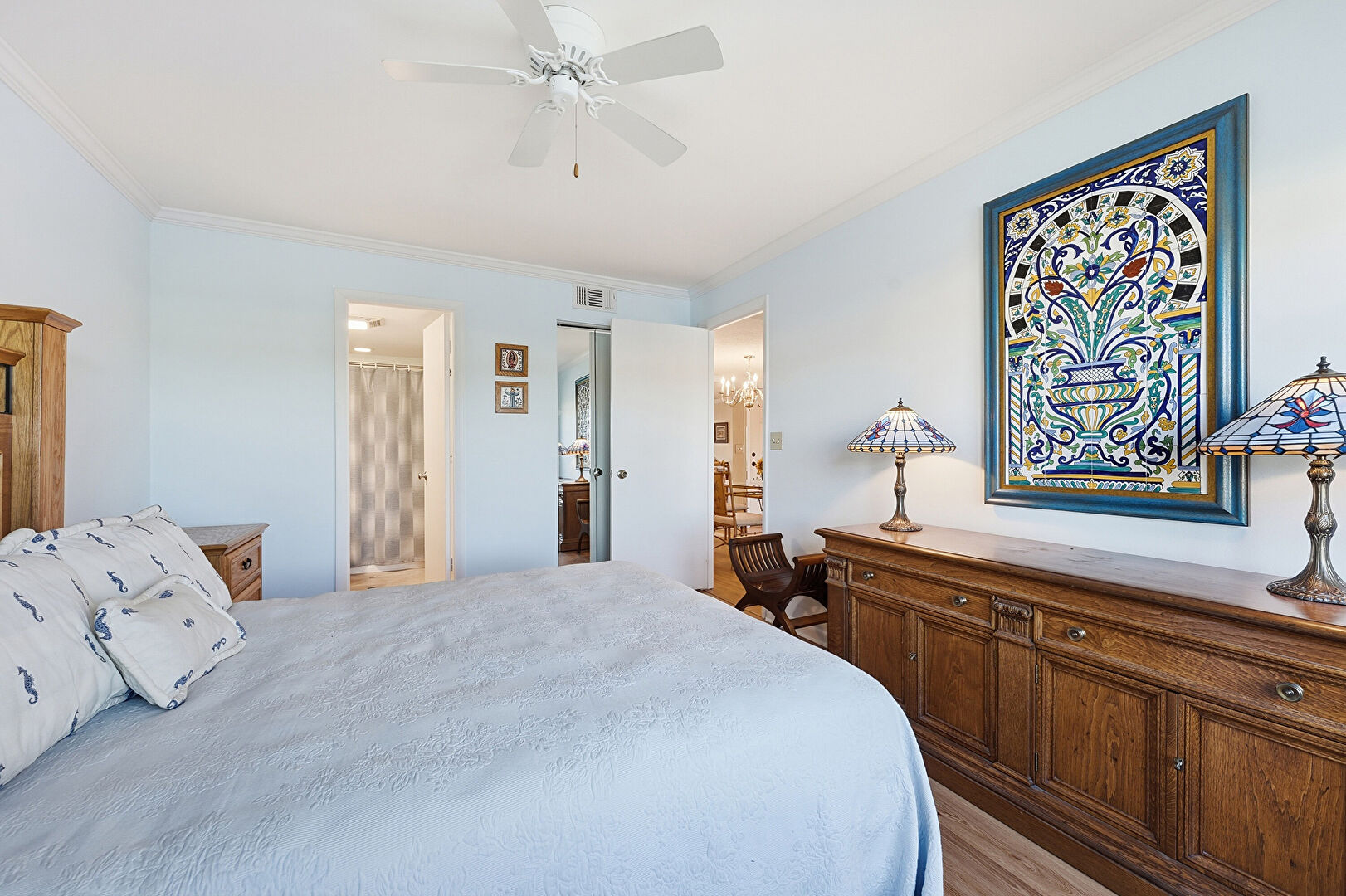 Baseboards Wall, Ceiling Fan, Closet, Crown Molding, Drywall, Ensuite Bathroom, Natural Light, Textured Ceiling, Vent, Wood Finish Floor, Baseboards Wall, Ceiling Fan, Drywall, Natural Light, Notable Chandelier