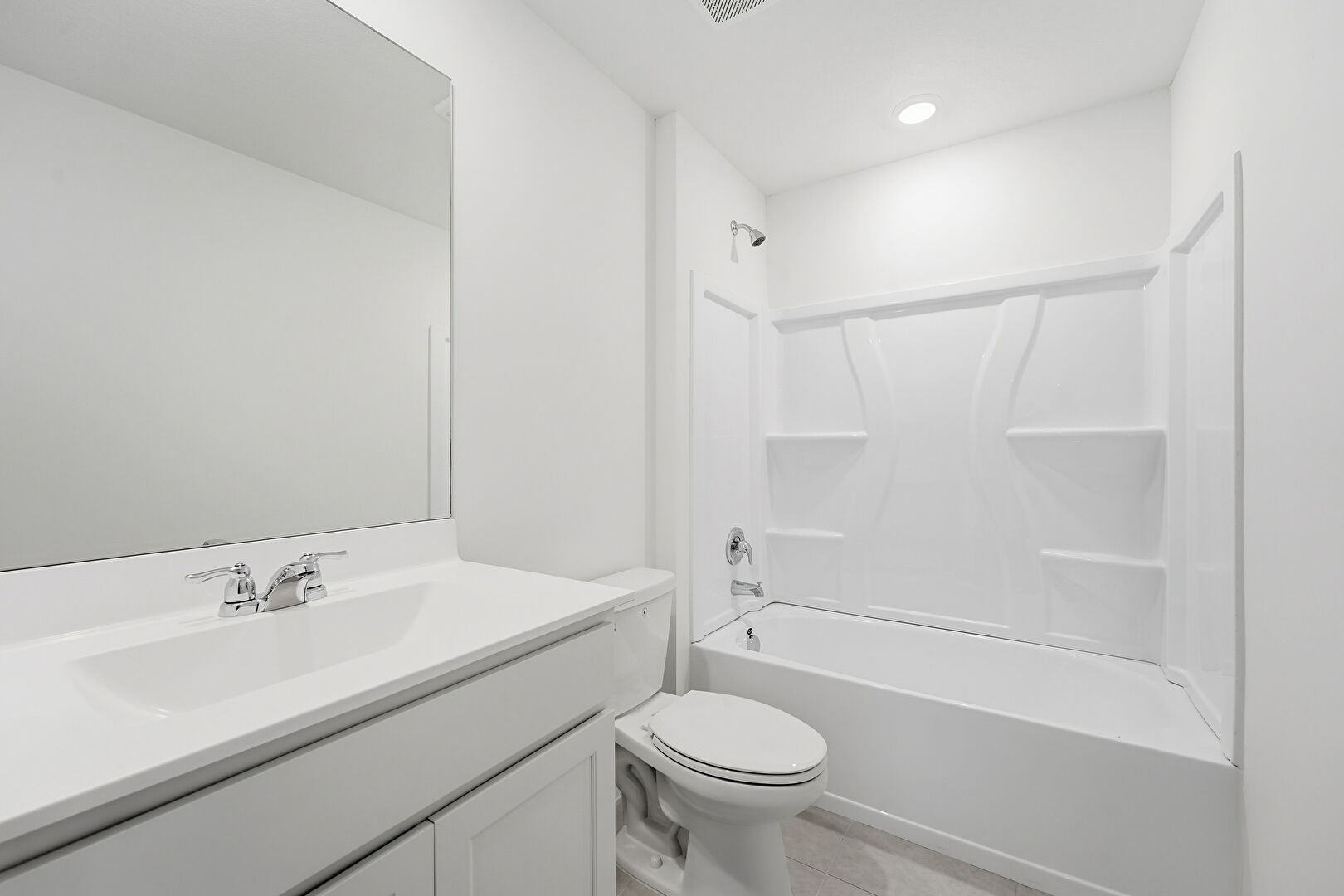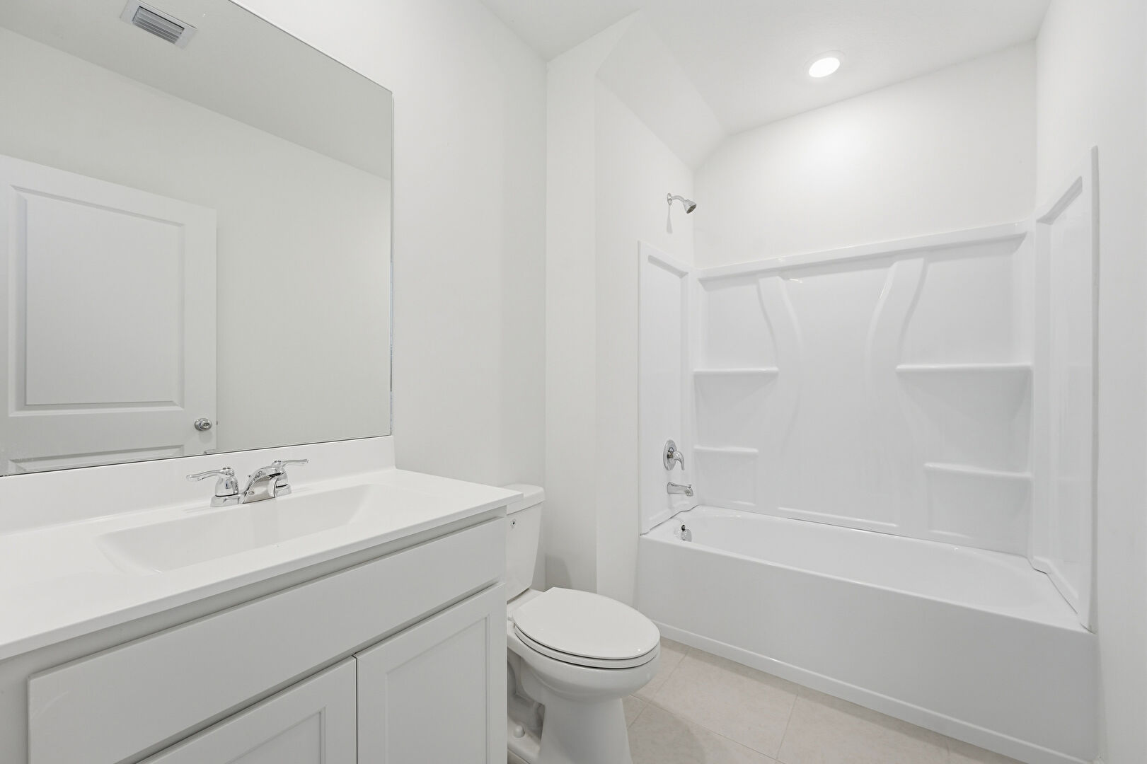 Combined Bath Shower, Drywall, Full Bathroom, Recessed Lighting, Tile Floor, Vanity, Vent, Full Bathroom, Tile Floor