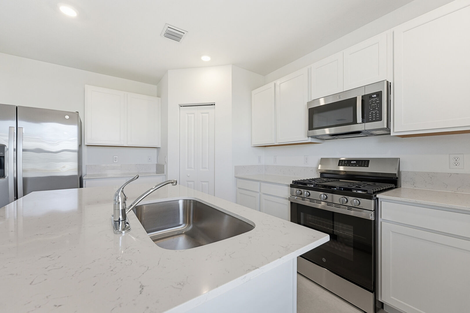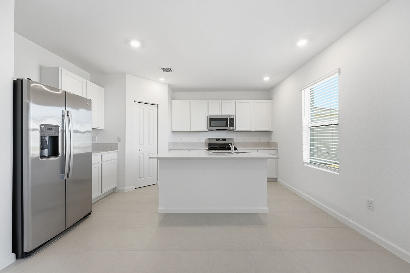 Drywall, Kitchen Island, L Shaped Kitchen, Natural Light, Recessed Lighting, Shaker Cabinets, Stone Countertops, Vent, Baseboards Wall, Shaker Cabinets