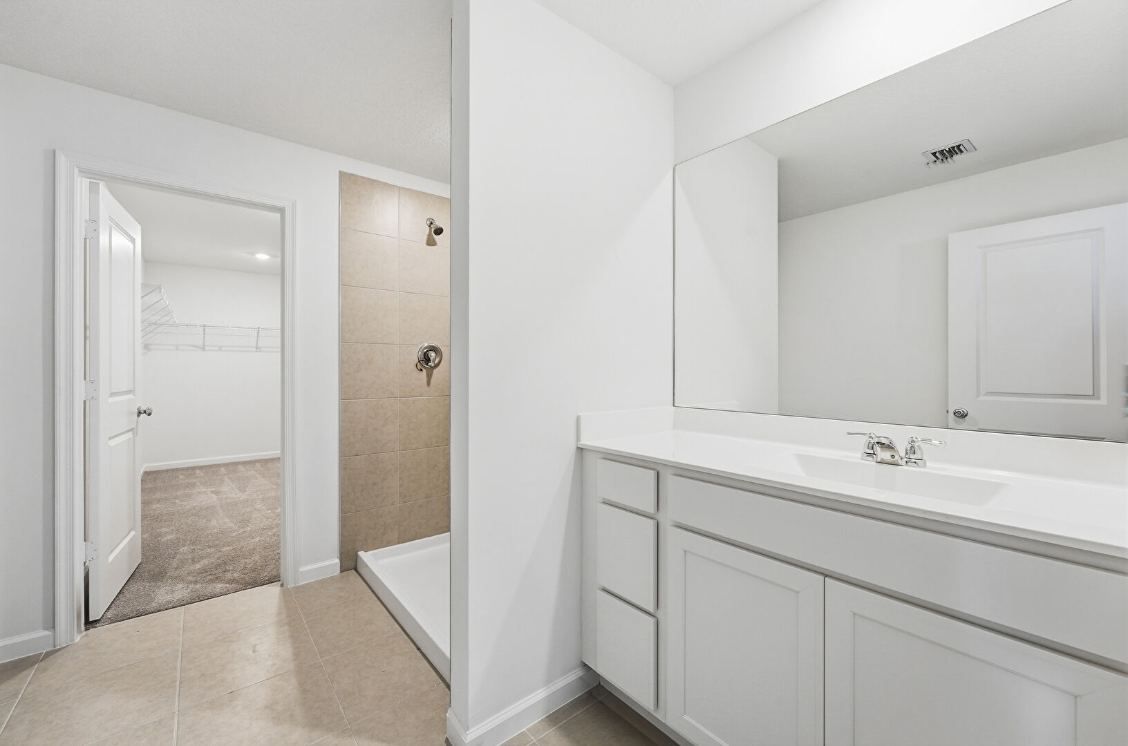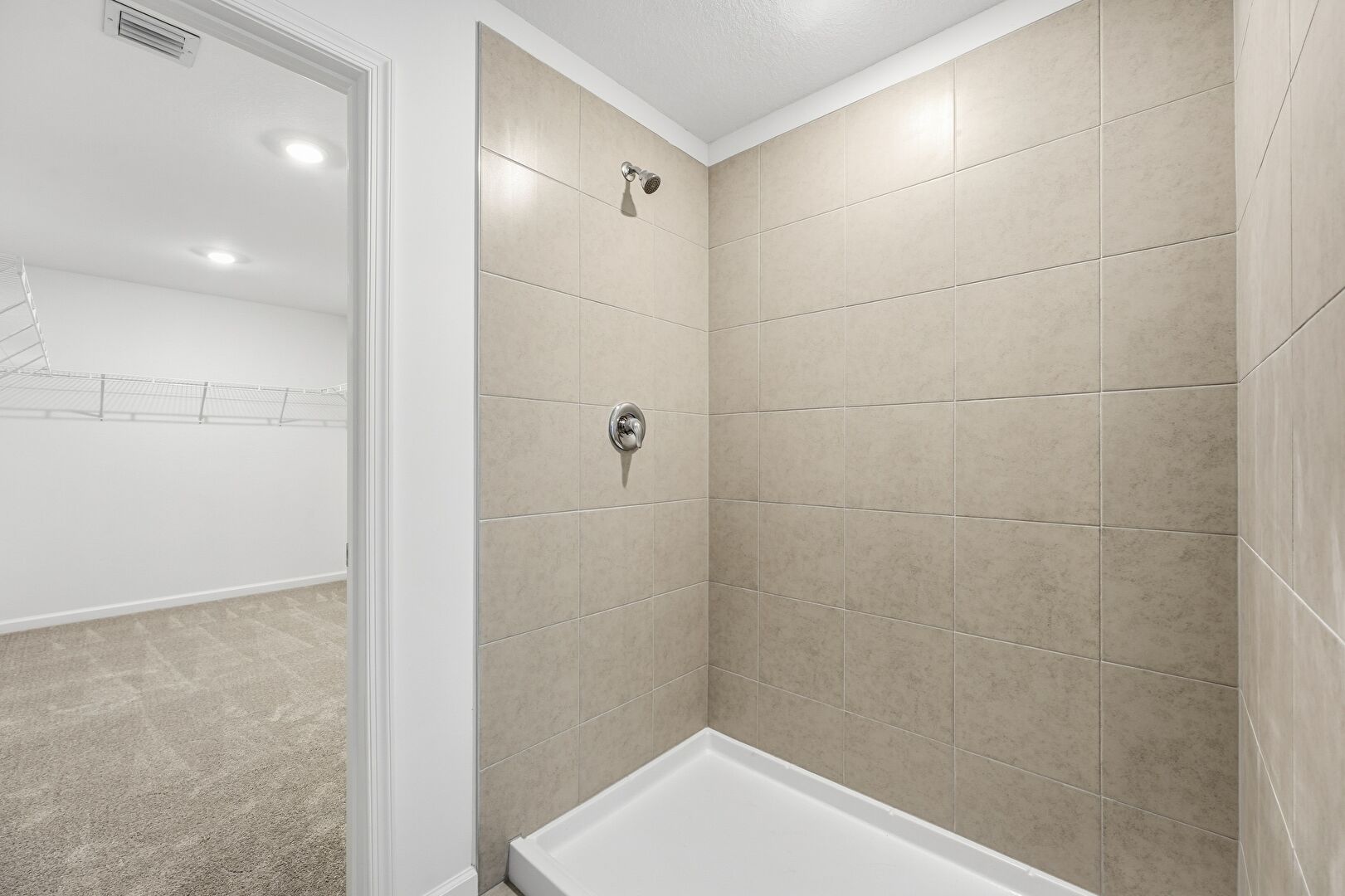 Baseboards Wall, Carpet, Drywall, Full Bathroom, Recessed Lighting, Tile Floor, Vanity, Vent, Walk In Closet, Vent, Walk In Closet