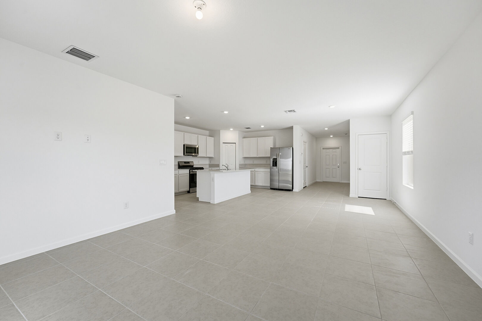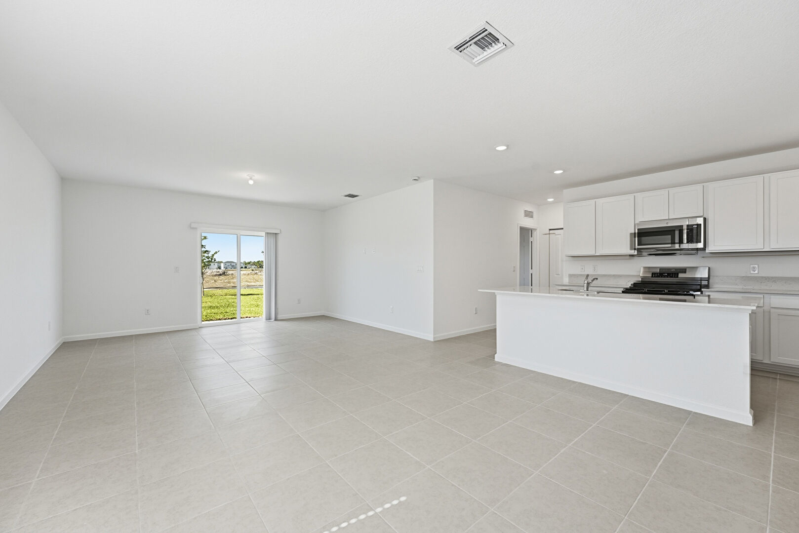 Baseboards Wall, Drywall, Kitchen Island, L Shaped Kitchen, Natural Light, Opens To Living Area, Recessed Lighting, Shaker Cabinets, Stone Countertops, Tile Floor, Vent, Baseboards Wall, Vent
