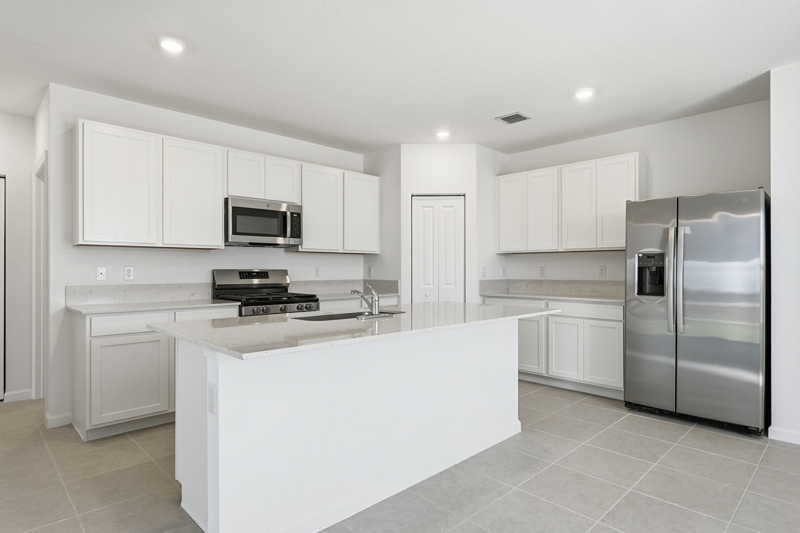 Baseboards Wall, Drywall, Kitchen Island, Recessed Lighting, Shaker Cabinets, Stone Countertops, Tile Floor, Vent, L Shaped Kitchen