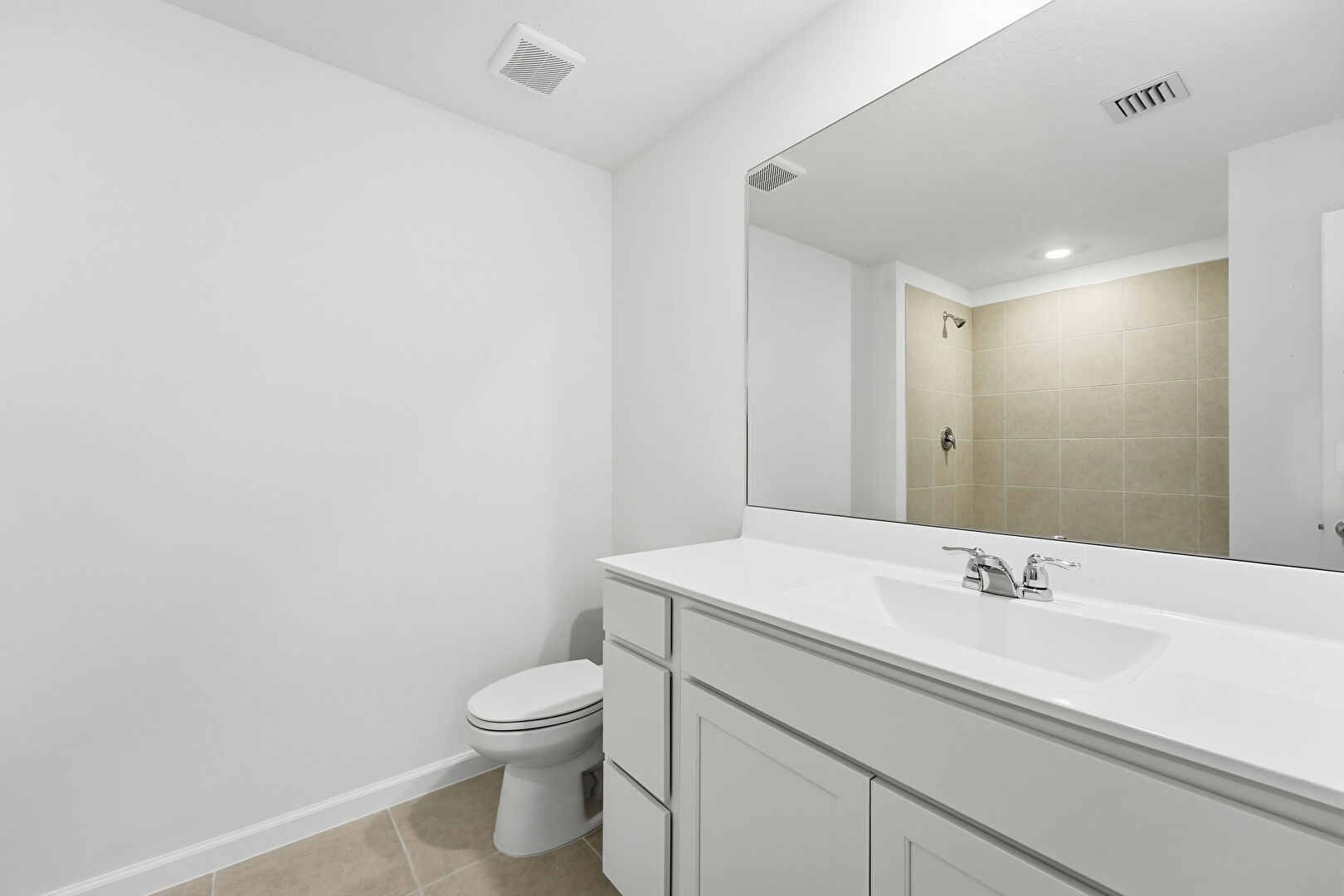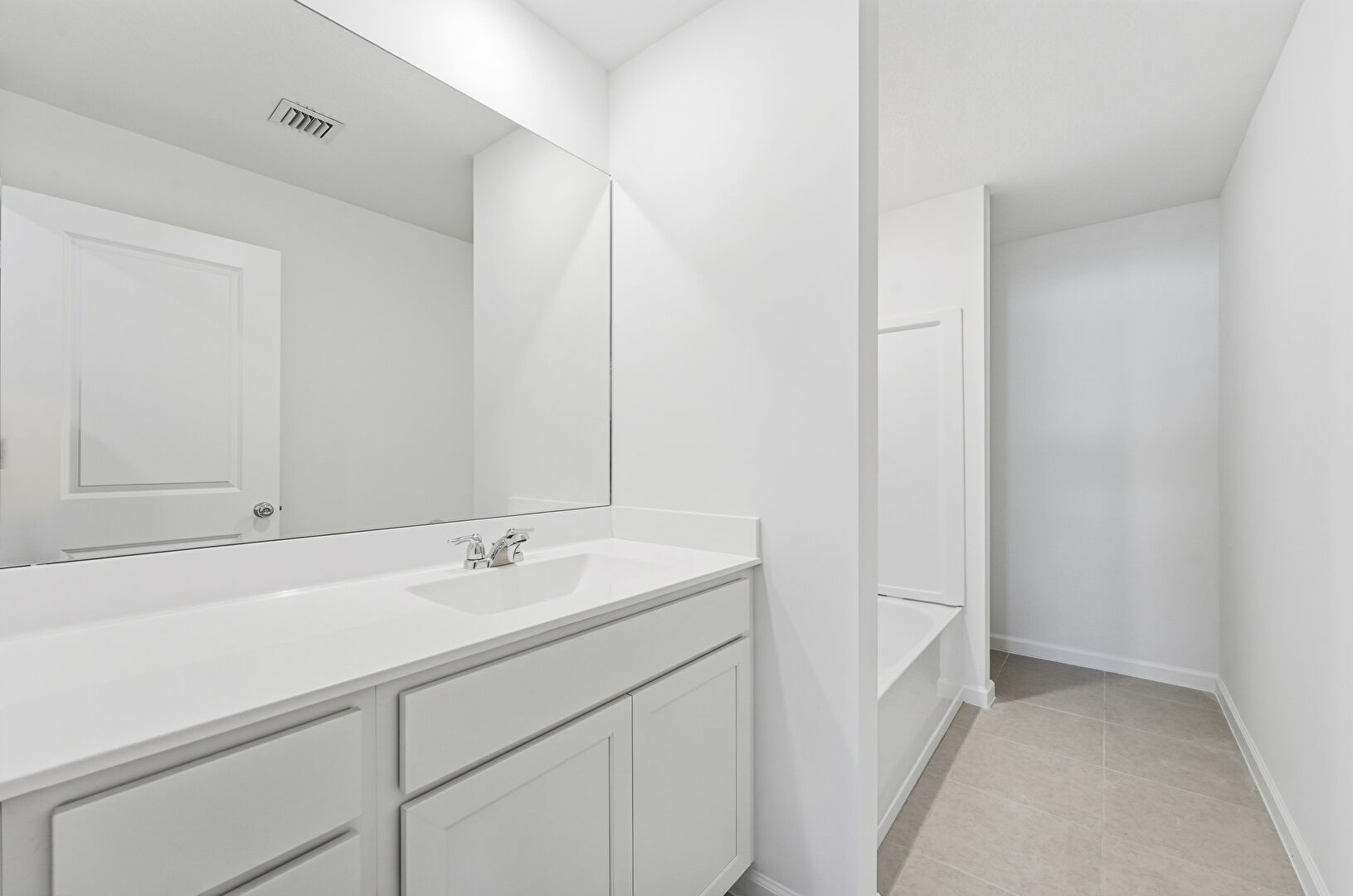 Baseboards Wall, Combined Bath Shower, Drywall, Full Bathroom, Recessed Lighting, Tile Floor, Vanity, Vent, Tile Floor, Vanity