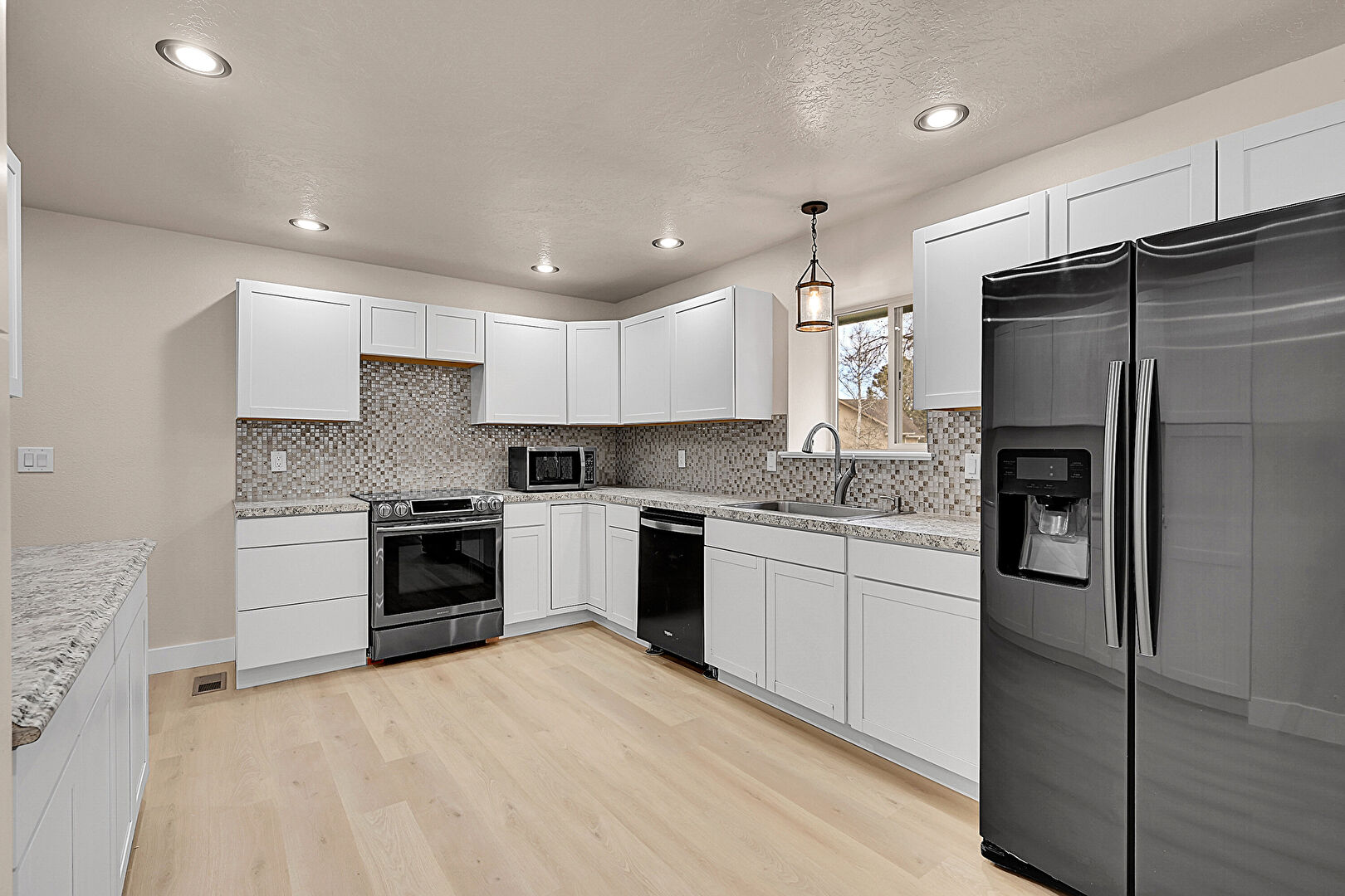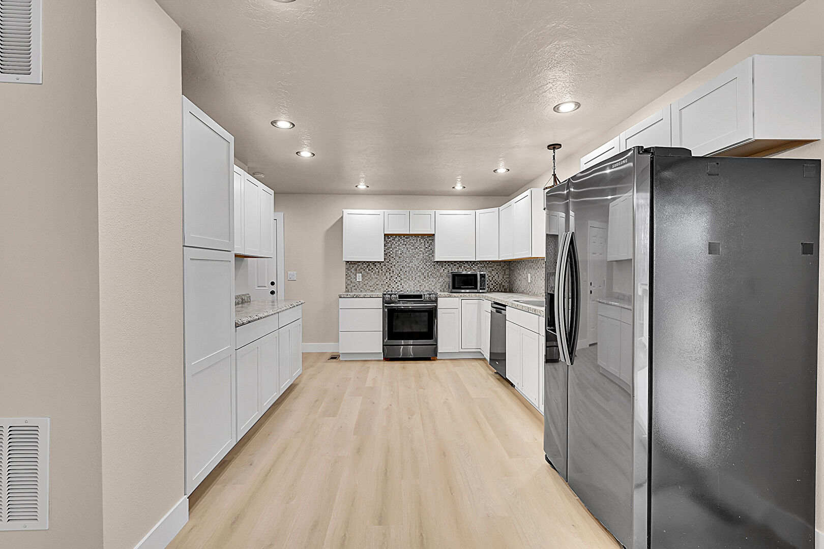 Baseboards Wall, Drywall, Natural Light, Notable Chandelier, Pendant Lighting, Recessed Lighting, Shaker Cabinets, Stone Countertops, Textured Ceiling, U Shaped Kitchen, Vent, Wood Finish Floor, Recessed Lighting, U Shaped Kitchen, Vent