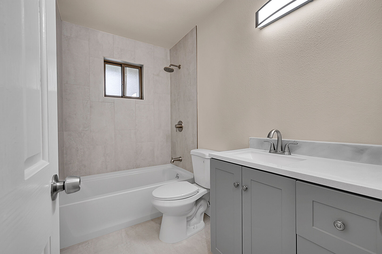 Full Bathroom, Natural Light, Textured Wall, Vanity, Combined Bath Shower