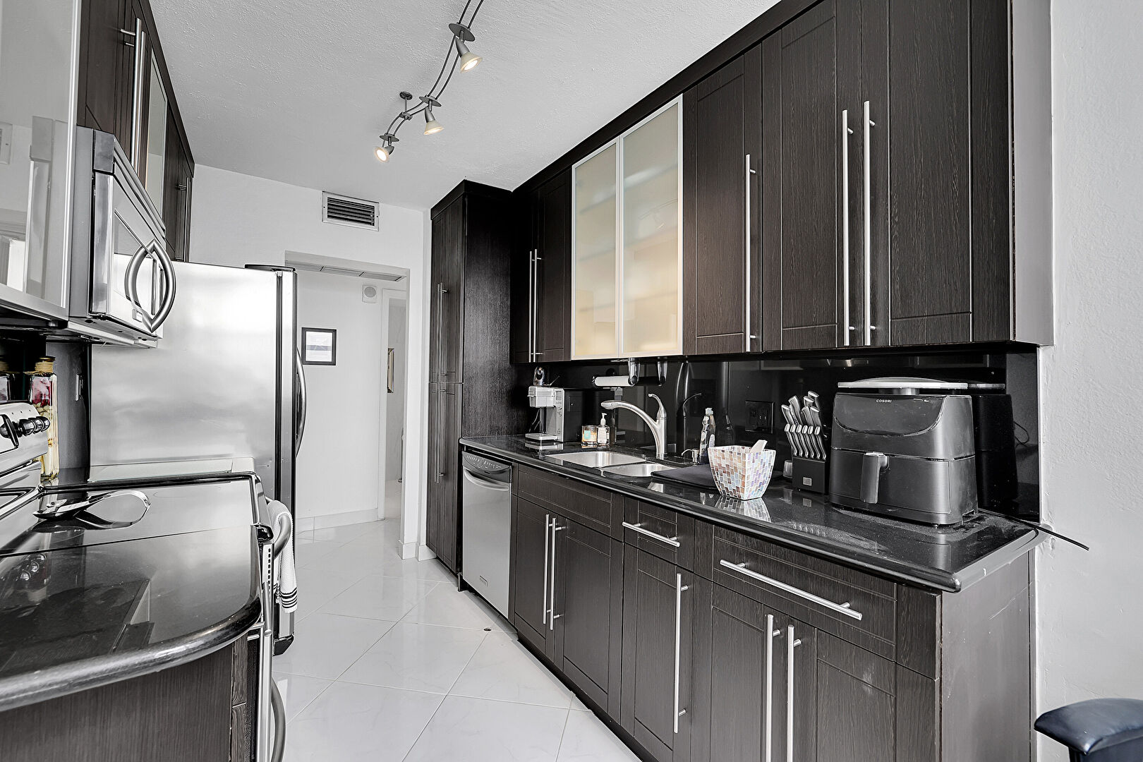 Baseboards Wall, Black Cabinets, Built In Desk, City View, Drywall, Galley Kitchen, Glass Insert Cabinets, Natural Light, Office Area, Shaker Cabinets, Stone Countertops, Textured Ceiling, Tile Floor, Track Lighting, Vent, Glass Insert Cabinets, Tile Floor
