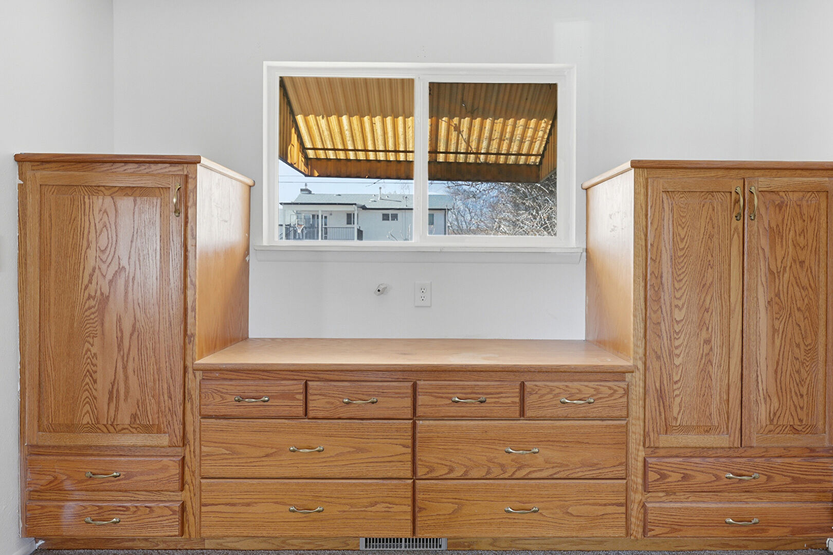 Drywall, Marble Finish Floor, Medium Brown Cabinets, Natural Light, Raised Cabinets, Stone Countertops, Vent, Visible Hinge Cabinets, Baseboards Wall, Stone Countertops