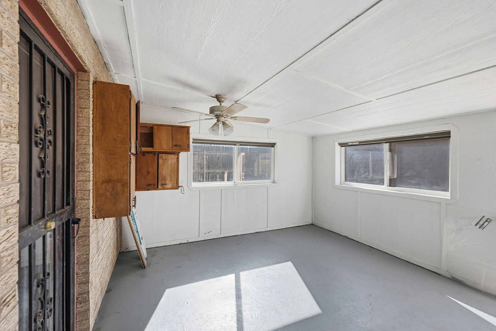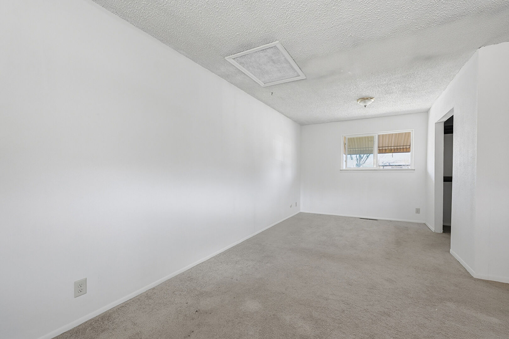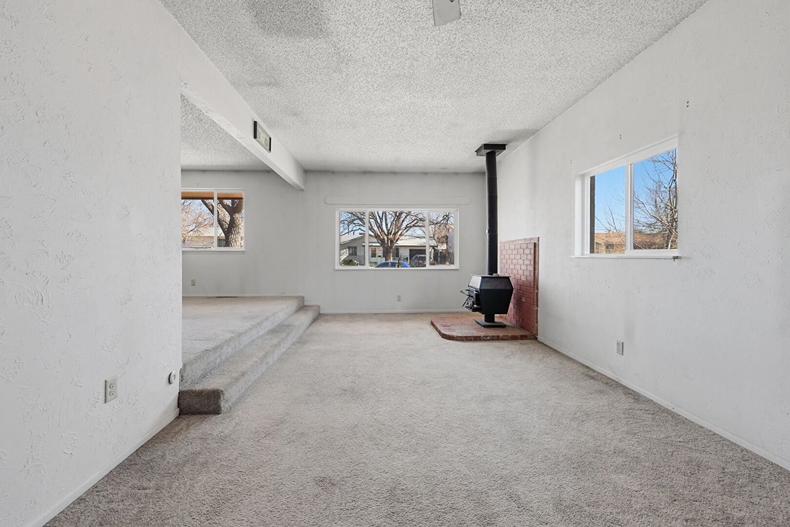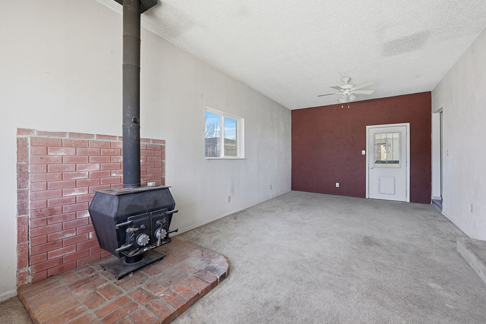 Baseboards Wall, Carpet, Ceiling Fan, Drywall, Natural Light, Textured Ceiling, Textured Wall, Vent, Wood Stove, Textured Ceiling, Vent, Wood Stove