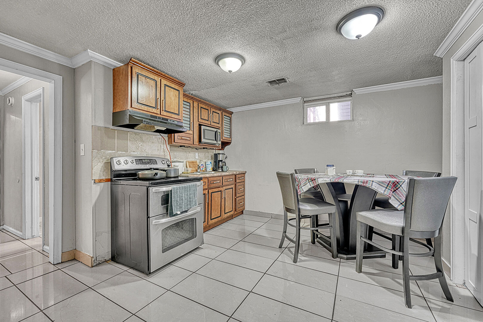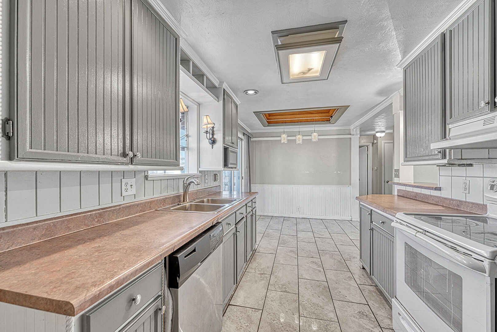 Baseboards Wall, Basement, Crown Molding, Crown Molding Cabinets, Drywall, Galley Kitchen, Gray Cabinets, Kitchen Peninsula, Laundry, Medium Brown Cabinets, Natural Light, Open Shelves, Pass Through Window, Pendant Lighting, Raised Cabinets, Recessed Lighting, Shaker Cabinets, Textured Ceiling, Tile Floor, Tray Ceiling, Vent, Visible Hinge Cabinets, Wainscot Wall, Washer Dryer, Wood Finish Floor, Crown Molding, Crown Molding Cabinets, Gray Cabinets, Recessed Lighting, Shaker Cabinets