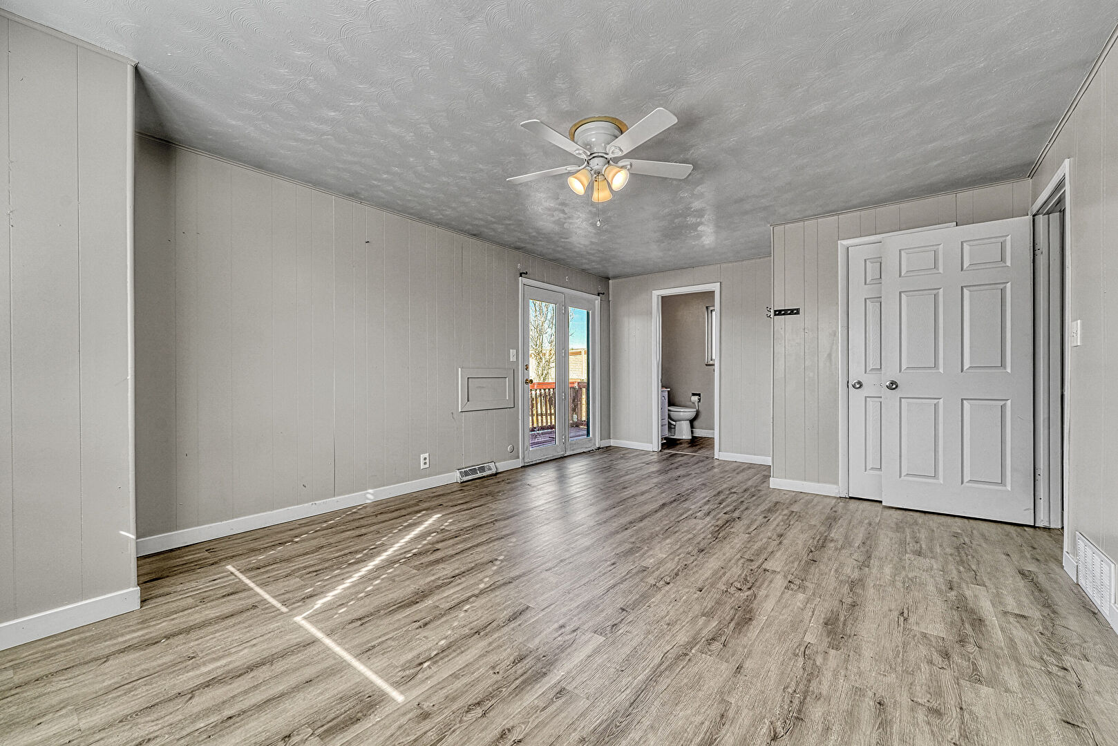 Access To Exterior, Baseboards Wall, Ceiling Fan, Closet, Ensuite Bathroom, Natural Light, Paneling Wall, Textured Ceiling, Vent, Wood Finish Floor, Wood Wall, Baseboards Wall, Textured Ceiling, Wood Wall