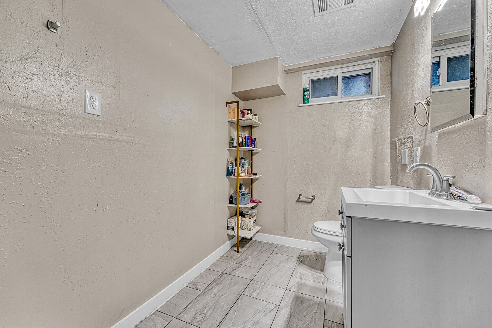 Baseboards Wall, Basement, Combined Bath Shower, Full Bathroom, Half Bathroom, Marble Finish Floor, Natural Light, Textured Ceiling, Textured Wall, Tile Wall, Vanity, Vent, Tile Floor, Vanity