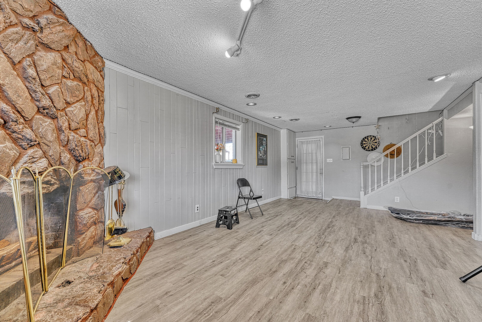 Baseboards Wall, Basement, Fireplace, Natural Light, Stairs, Textured Ceiling, Textured Wall, Track Lighting, Vent, Wood Finish Floor, Wood Wall, Textured Ceiling, Wood Wall