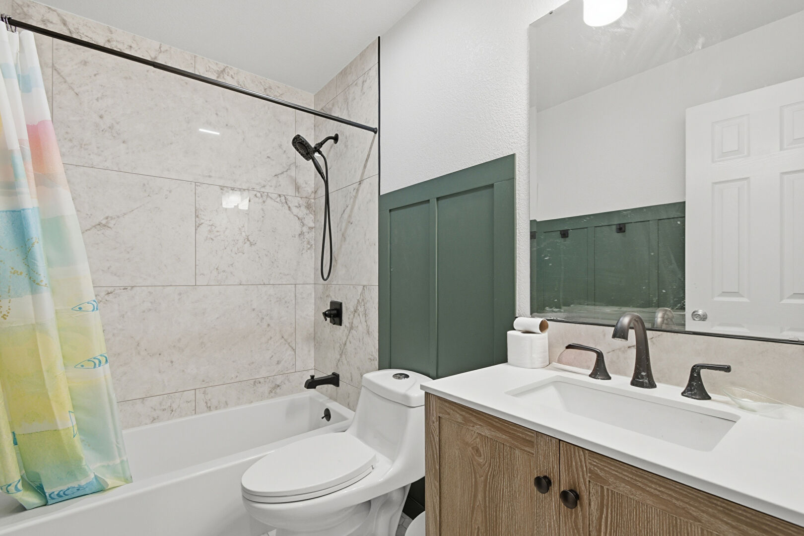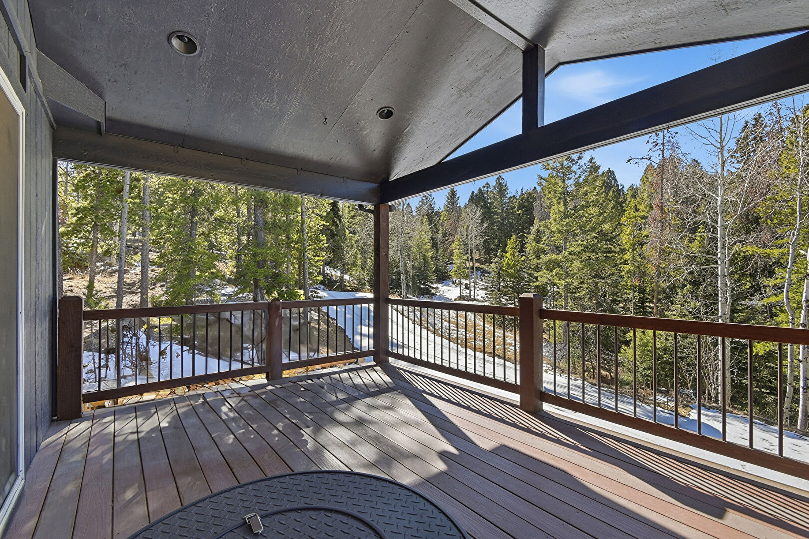 Chimney, Deck, Downspout, Gutters, Vertical Siding, Stairs