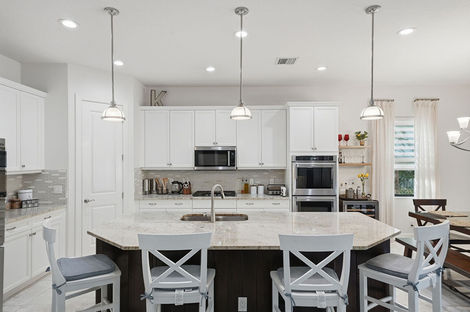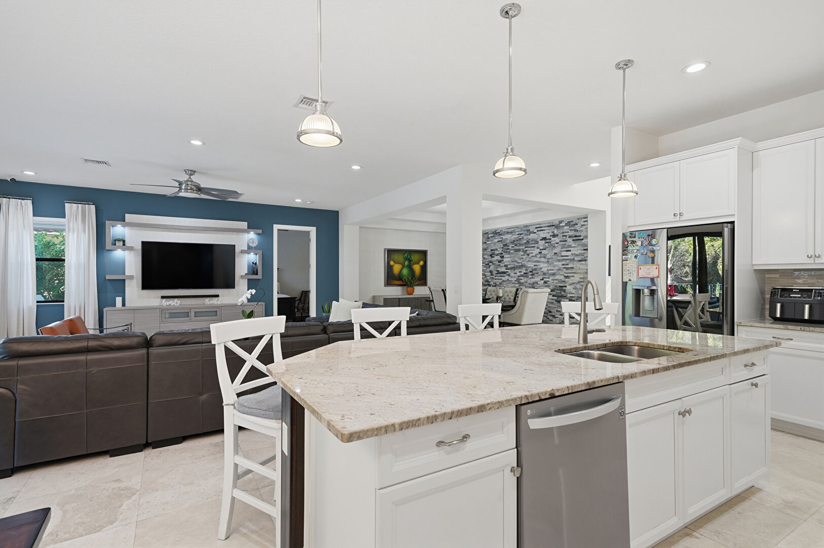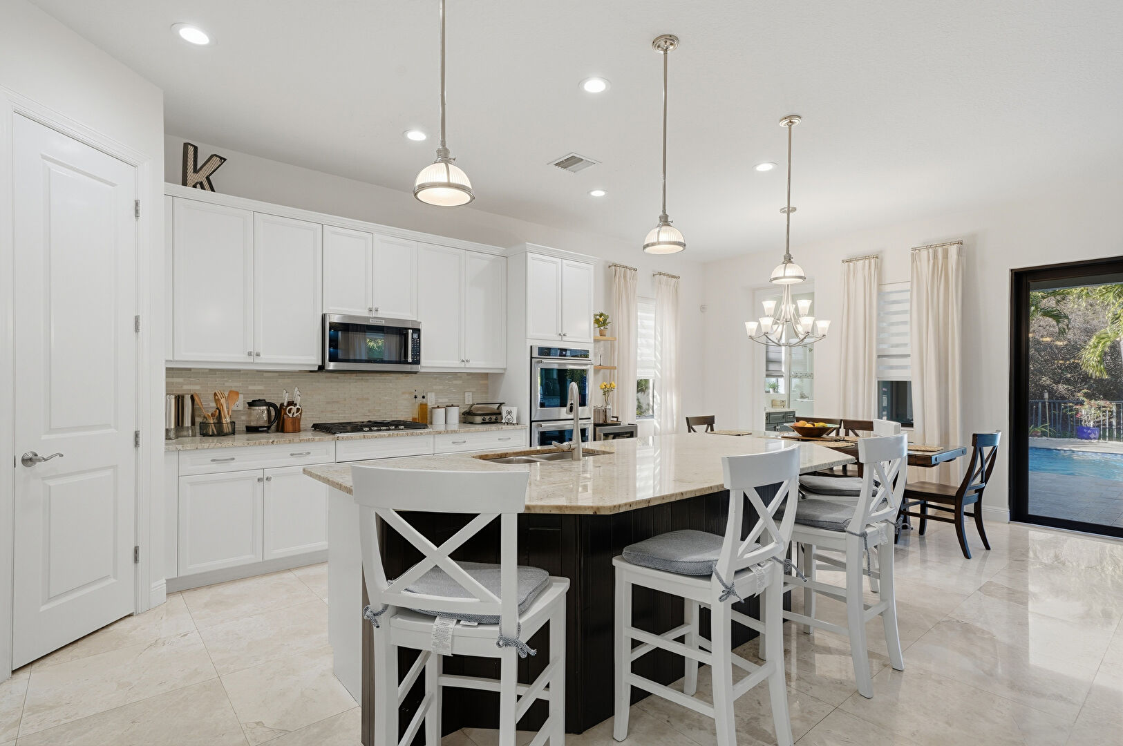 Accent Wall, Baseboards Wall, Ceiling Fan, Double Oven, Drywall, L Shaped Kitchen, Natural Light, Notable Chandelier, Pool View, Recessed Lighting, Stairs, Stone Wall, Vent, Baseboards Wall, Ceiling Fan, High Ceiling, Natural Light