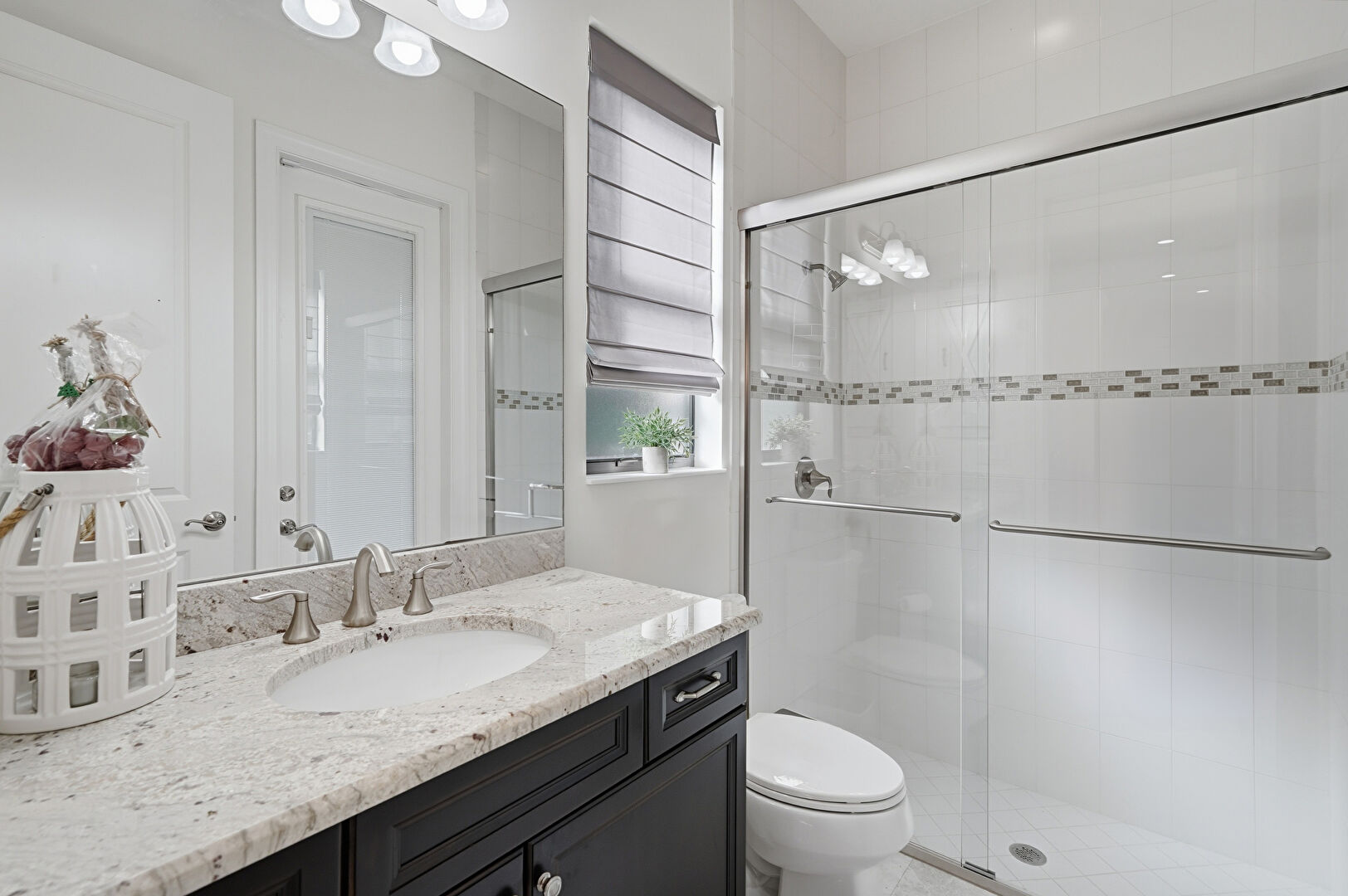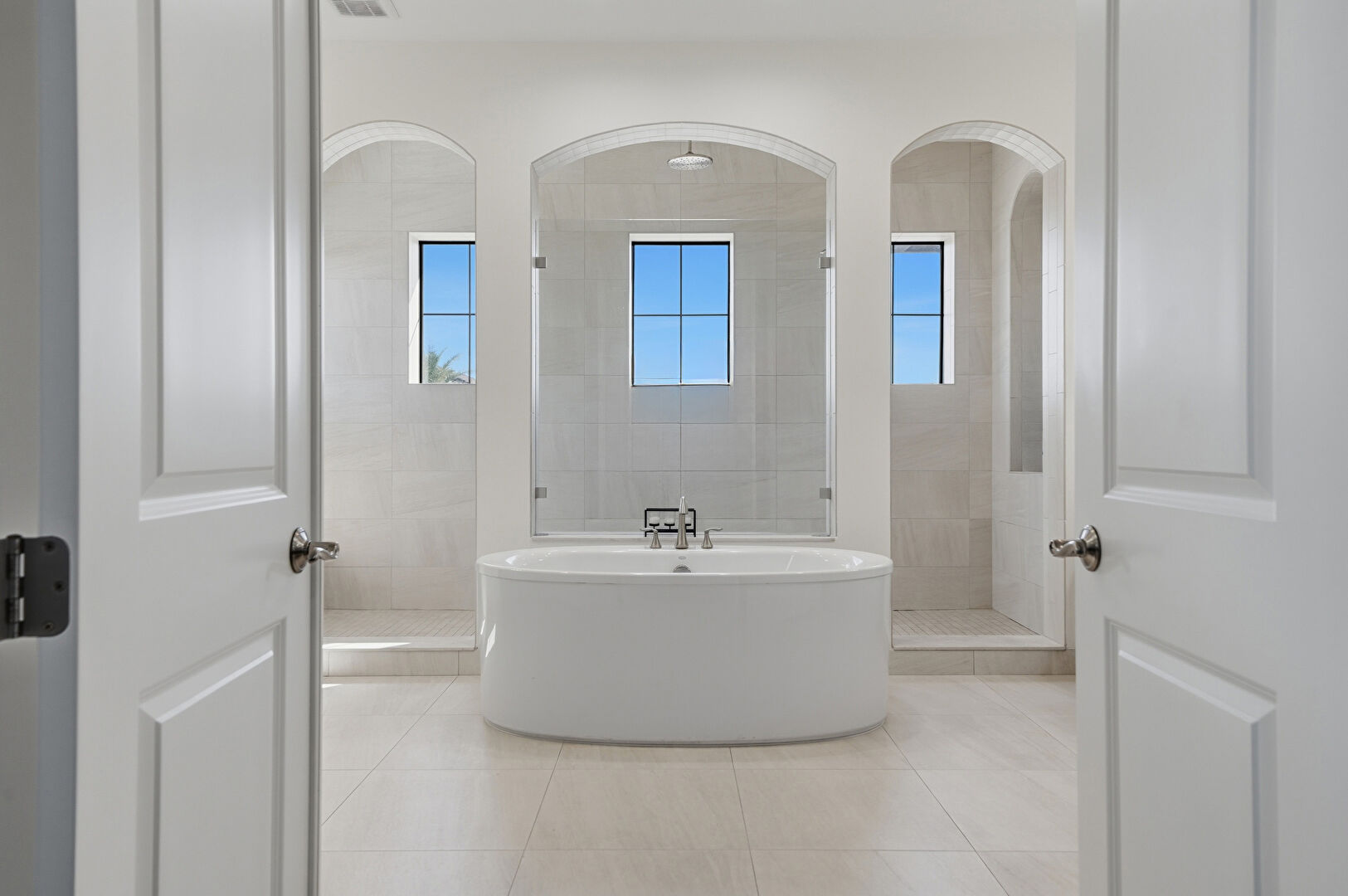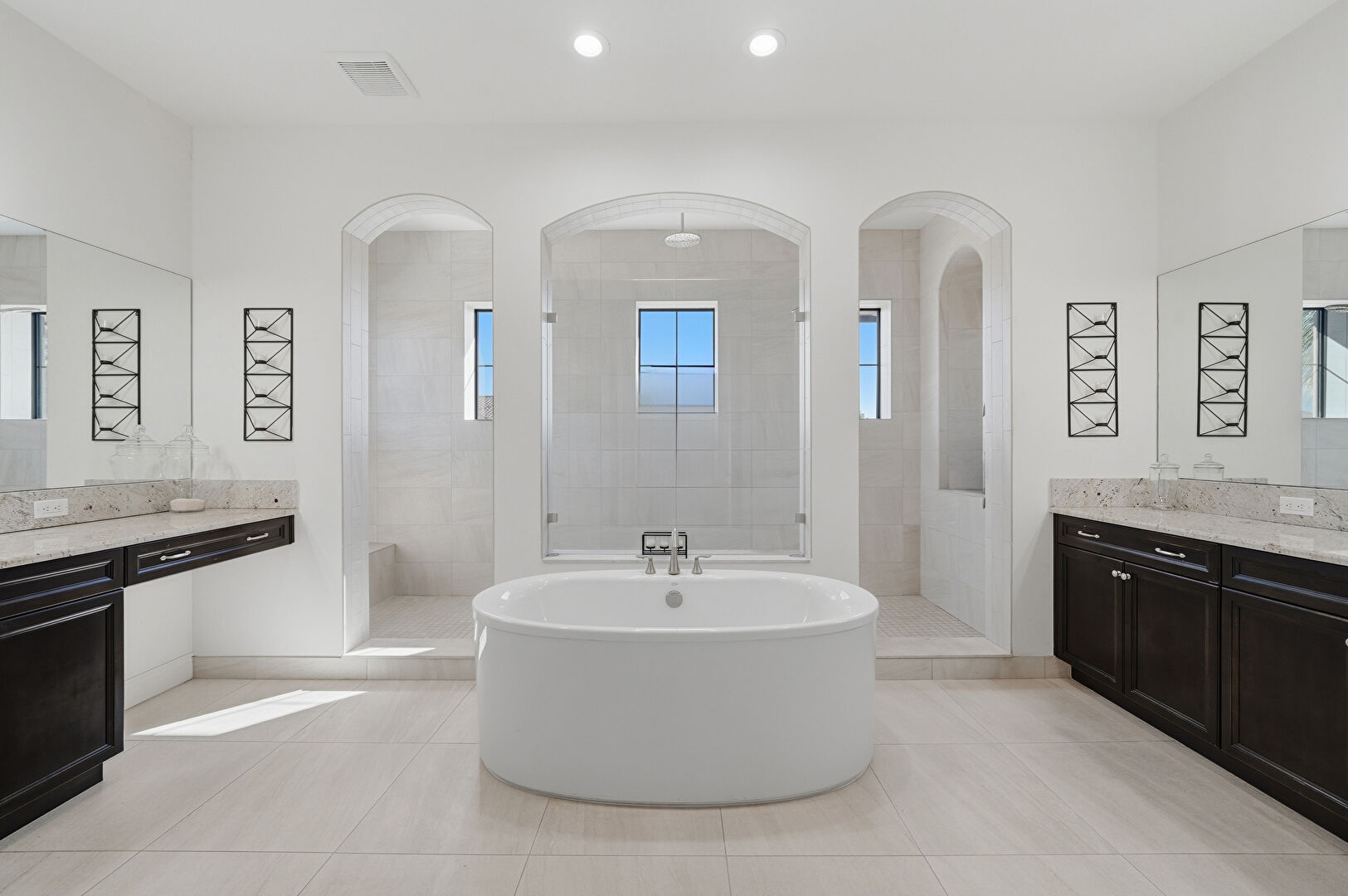 Baseboards Wall, Combined Bath Shower, Double Vanity, Drywall, Full Bathroom, Natural Light, Recessed Lighting, Tile Floor, Vanity, Drywall, Full Bathroom, Half Bathroom, Natural Light, Tile Floor