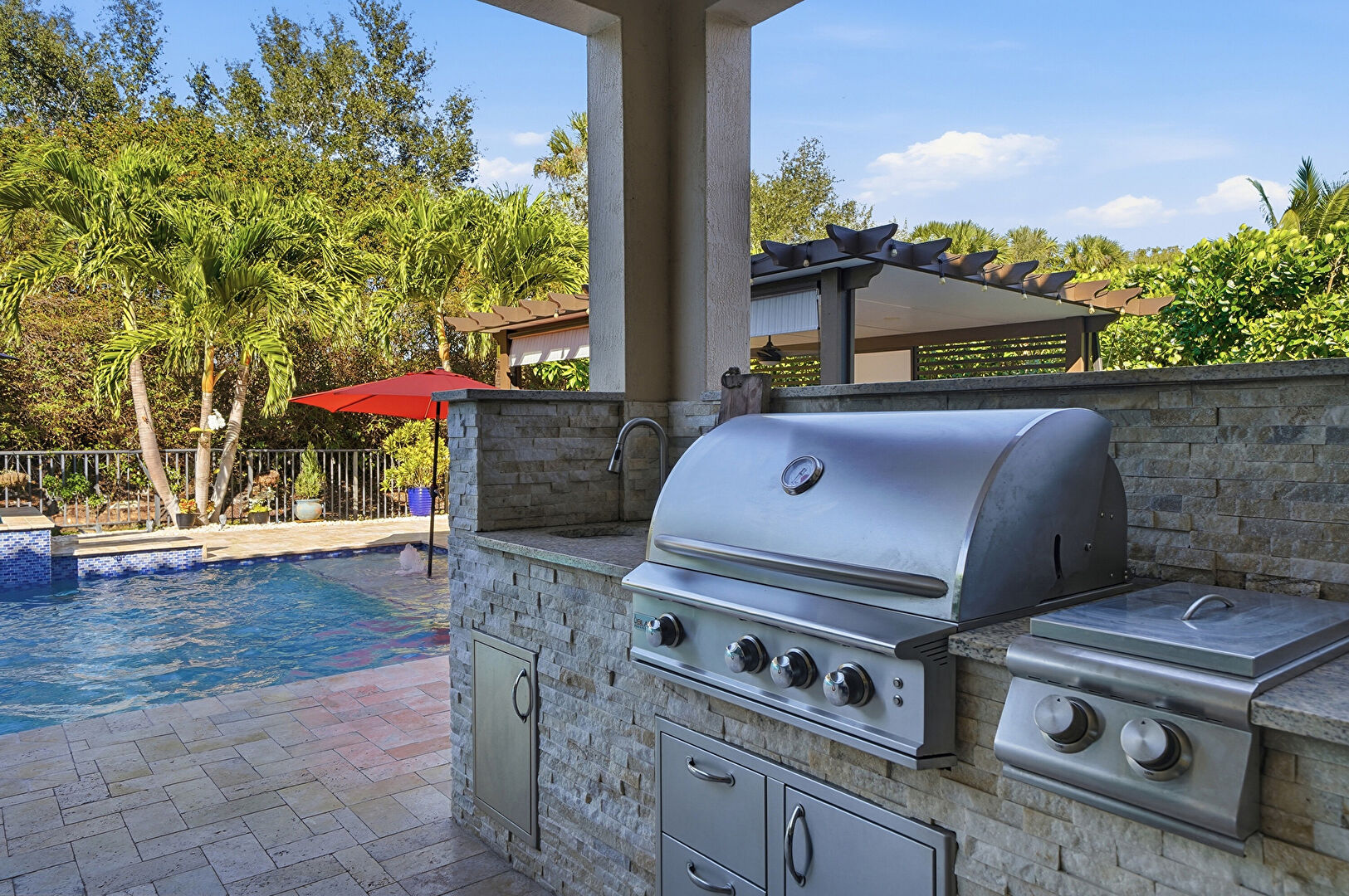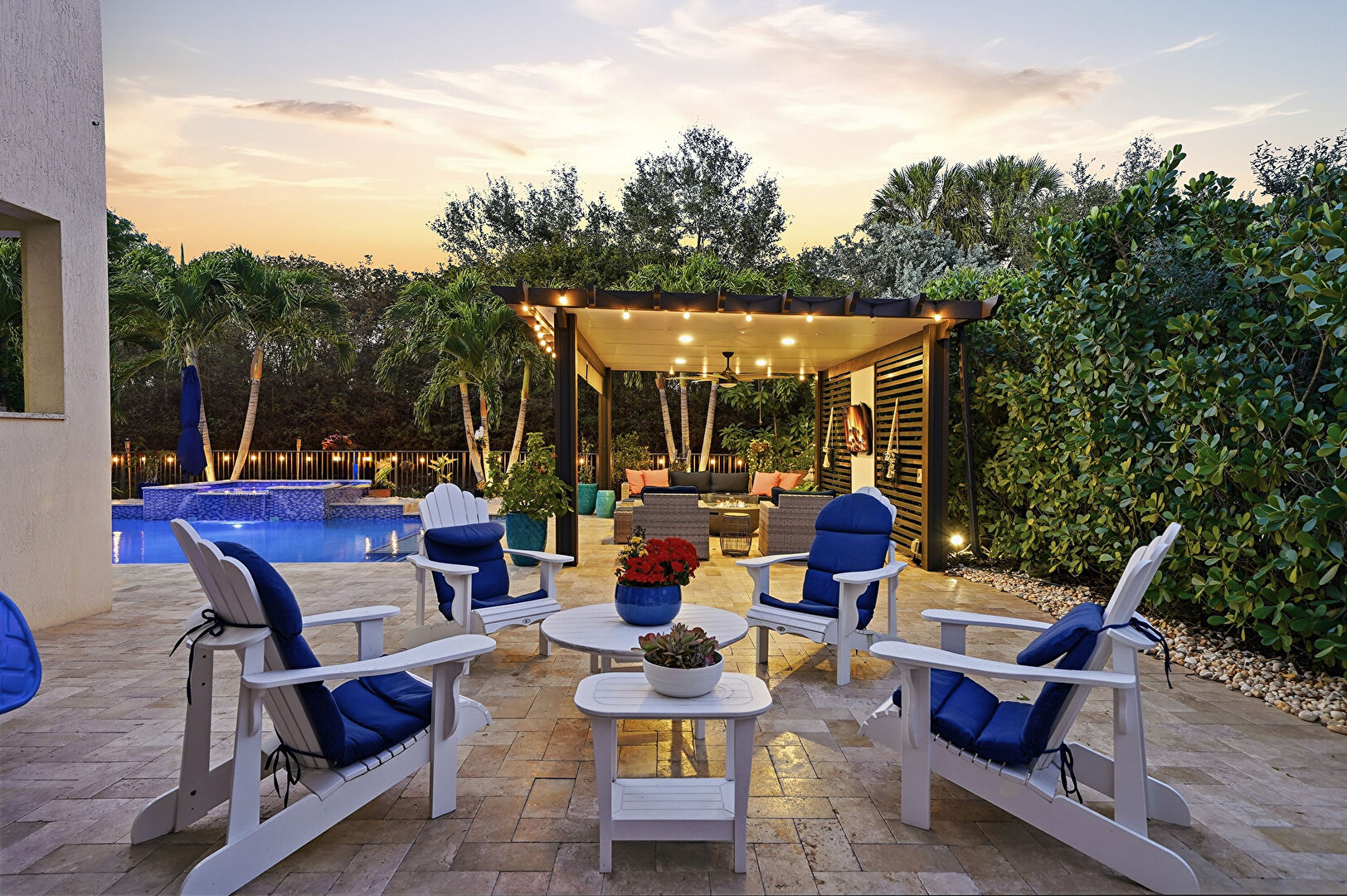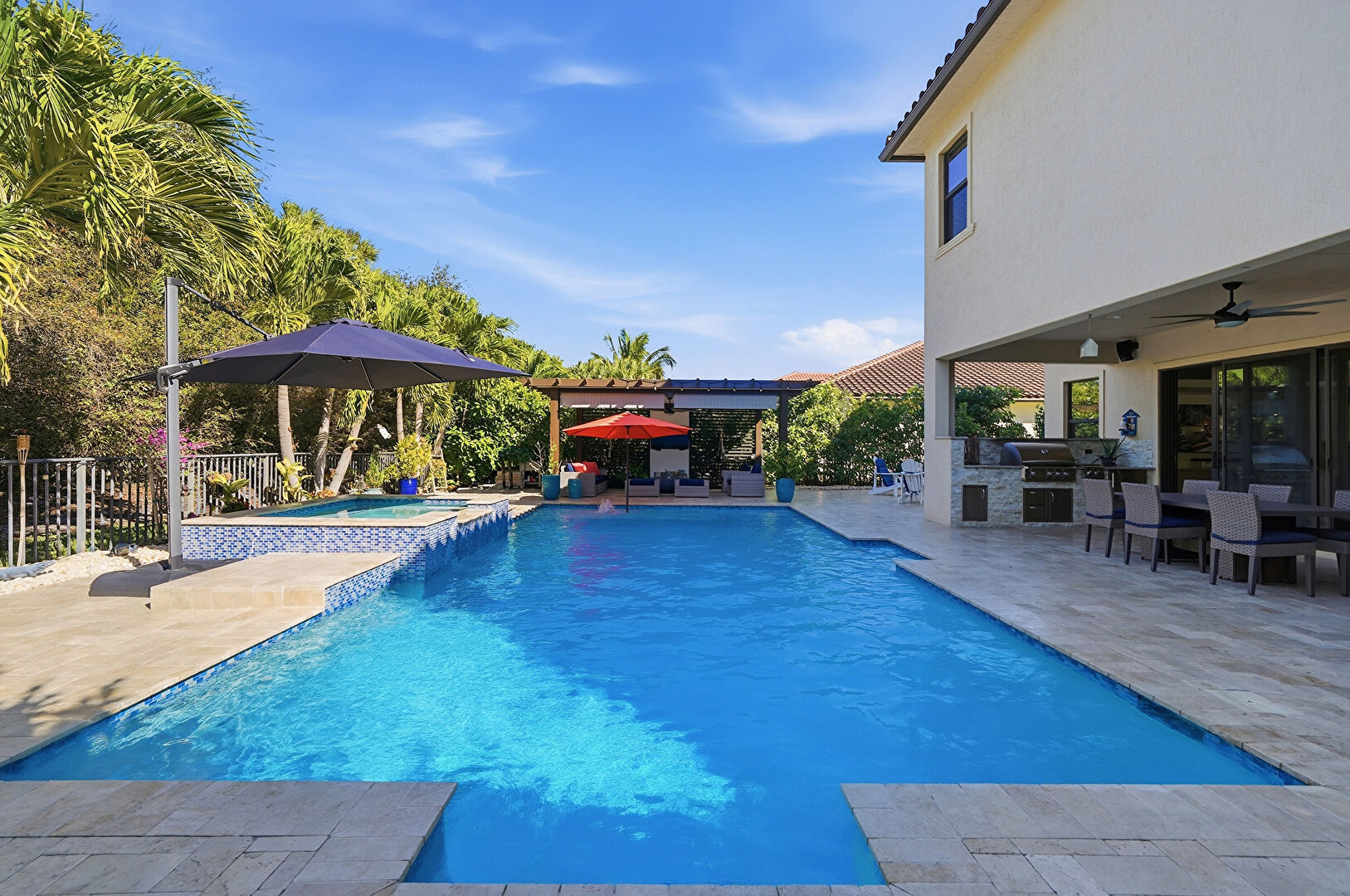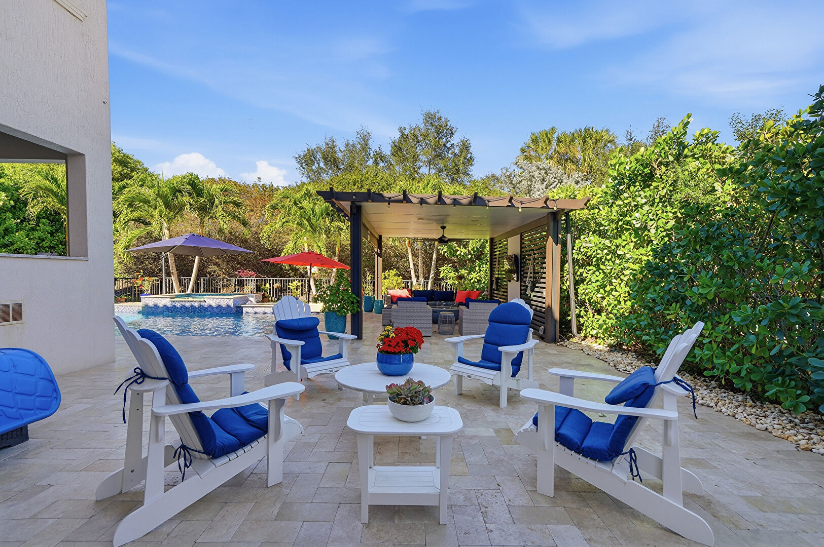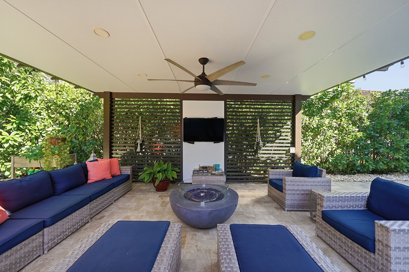 Ceiling Fan, Fence, Fire Pit, Gazebo, Grill, Hot Tub, Outdoor Dining Area, Outdoor Kitchen, Outdoor Living Space, Patio, Pergola, Pool, Pool Hot Tub Combo, Pool Water Feature, Ceiling Fan, Hot Tub, Outdoor Living Space, Patio, Pergola, Pool, Pool Water Feature