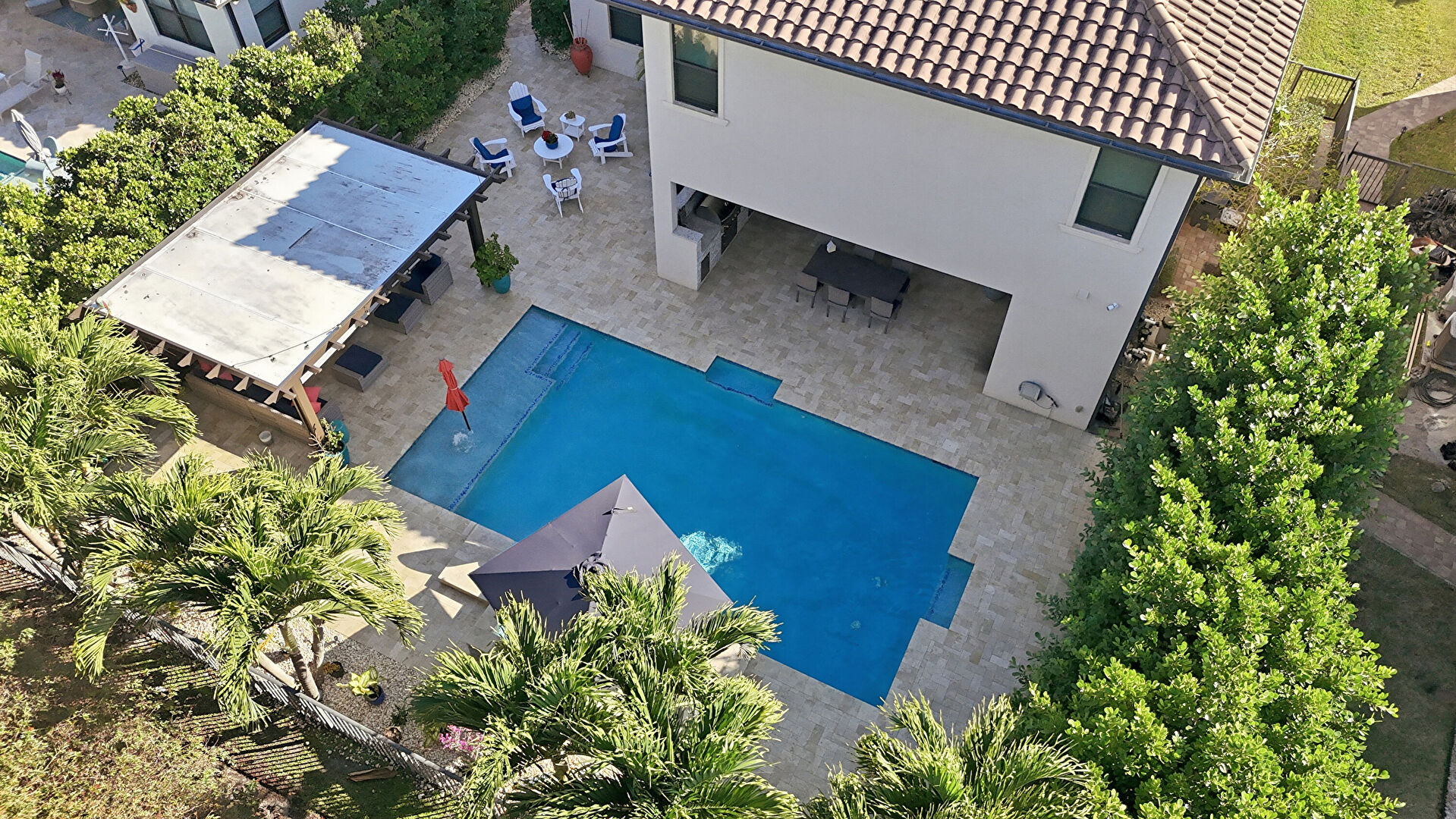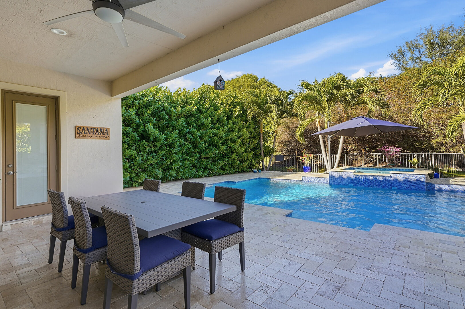 Ceiling Fan, Downspout, Gutters, Outdoor Dining Area, Outdoor Living Space, Patio, Pergola, Pool, Pool Hot Tub Combo, Stucco Siding, Tile Roof, Ceiling Fan, Hot Tub