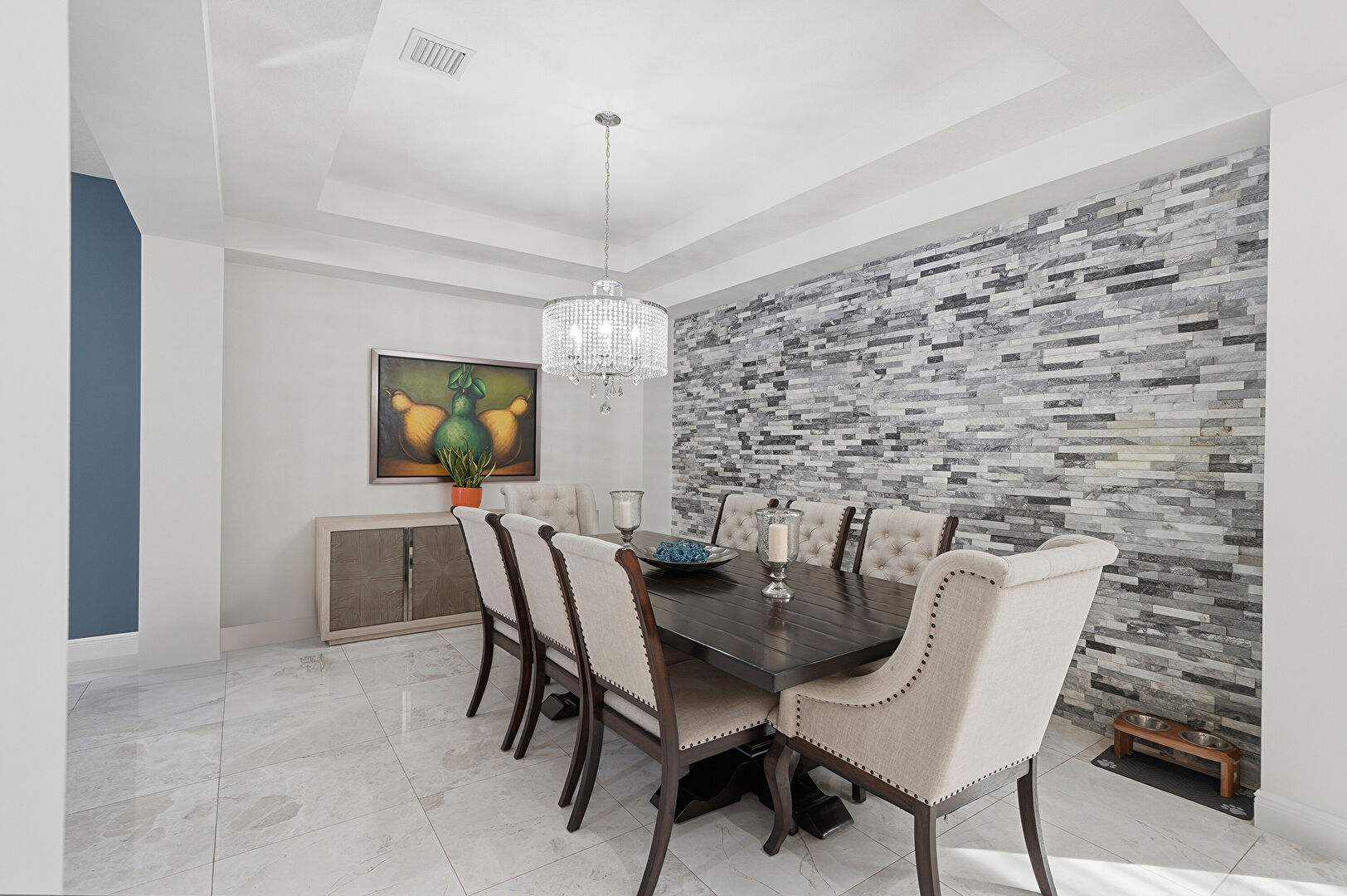Accent Wall, Baseboards Wall, Ceiling Fan, Drywall, Indoor Bar, Natural Light, Notable Chandelier, Recessed Lighting, Stairs, Stone Wall, Tray Ceiling, Vent, Wine Cooler, Drywall, Notable Chandelier, Tray Ceiling