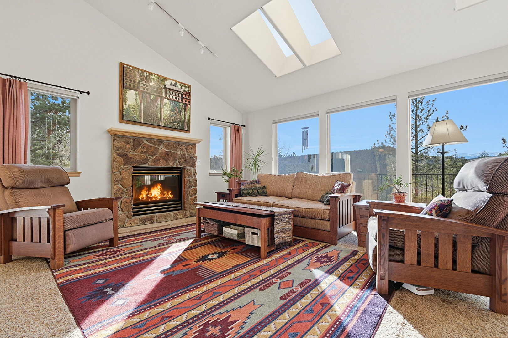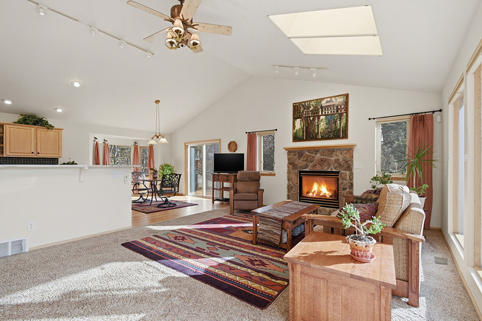 Carpet, Cathedral Ceiling, Ceiling Fan, Drywall, High Ceiling, Natural Light, Skylight, Track Lighting, Vaulted Ceiling, Vent, Fireplace, Natural Light, Skylight, Track Lighting