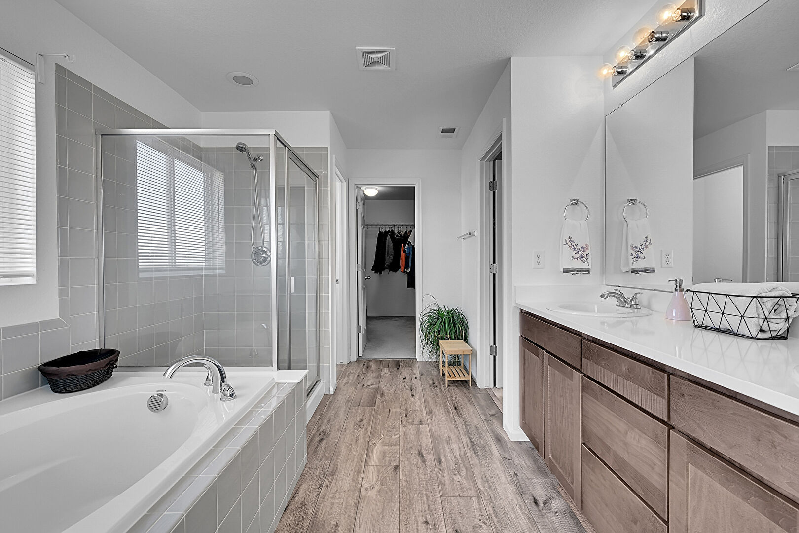 Drywall, Full Bathroom, Natural Light, Vanity, Walk In Closet, Wood Finish Floor, Vent