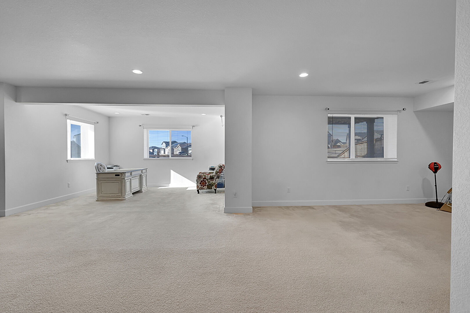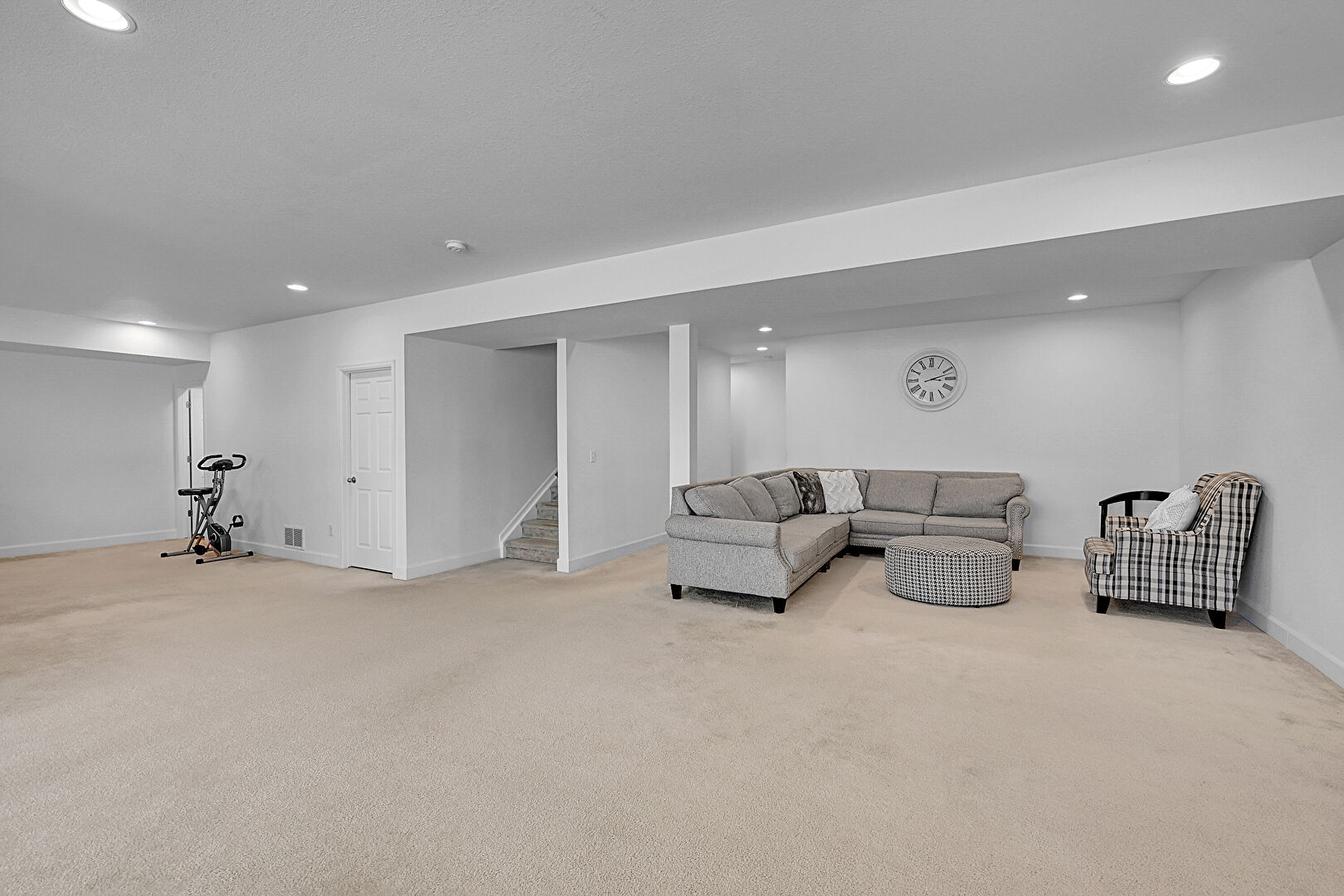 Baseboards Wall, Basement, Carpet, Drywall, Recessed Lighting, Stairs, Natural Light, Vent