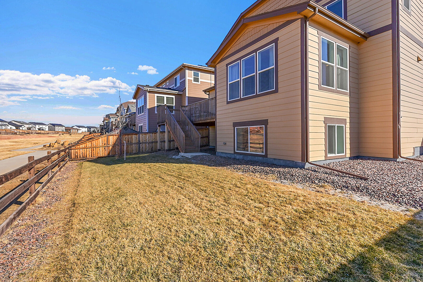 Concrete Foundation, Deck, Downspout, Fence, Gutters, Horizontal Siding, Lawn, Residential View, Shake Shingle Siding, Stairs, Gutters, Lawn